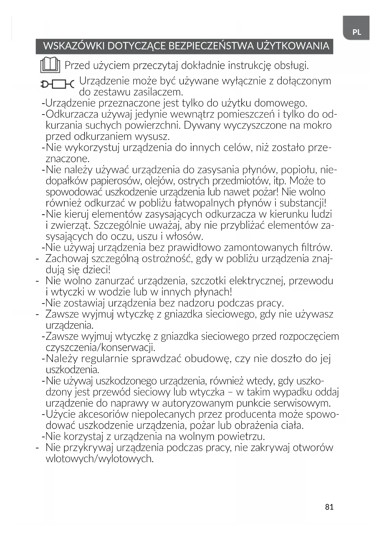 WSKAZÓWKI DOTYCZĄCE BEZPIECZEŃSTWA UŻYTKOWANIA Przed użyciem przeczytaj dokładnie instrukcję obsługi. Urządzenie może być używane wyłącznie z dołączonym do zestawu zasilaczem. - Urządzenie przeznaczone jest tylko do użytku domowego.