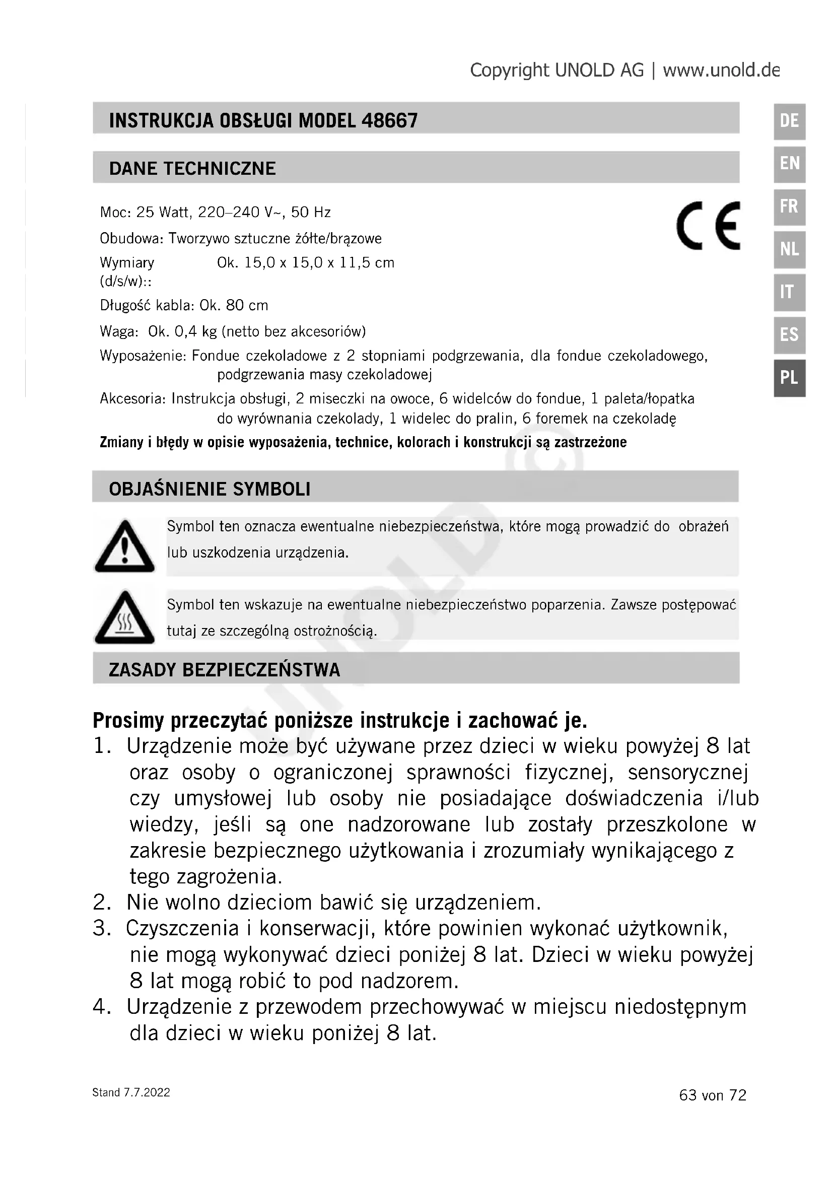 być dostarczone przez producenta lub jego usługi lub podobnie wykwalifikowaną osobę zostać zastąpiony w celu uniknięcia zagrożenia. OSTROŻNIE: Urządzenie podczas pracy jest bardzo gorące! W żadnym wypadku nie otwierać obudowy urządzenia. Istnieje niebezpieczeństwo porażenia prądem. Producent nie przejmuje odpowiedzialności za nieodpowiednie bądź wadliwe użytkowanie lub po przeprowadzonych naprawach przez nieautoryzowane zakłady bądź niekompetentne osoby. UNOLD © Copyright UNOLD AG | www.unold.de66 von 72 Stand 7.7.2022