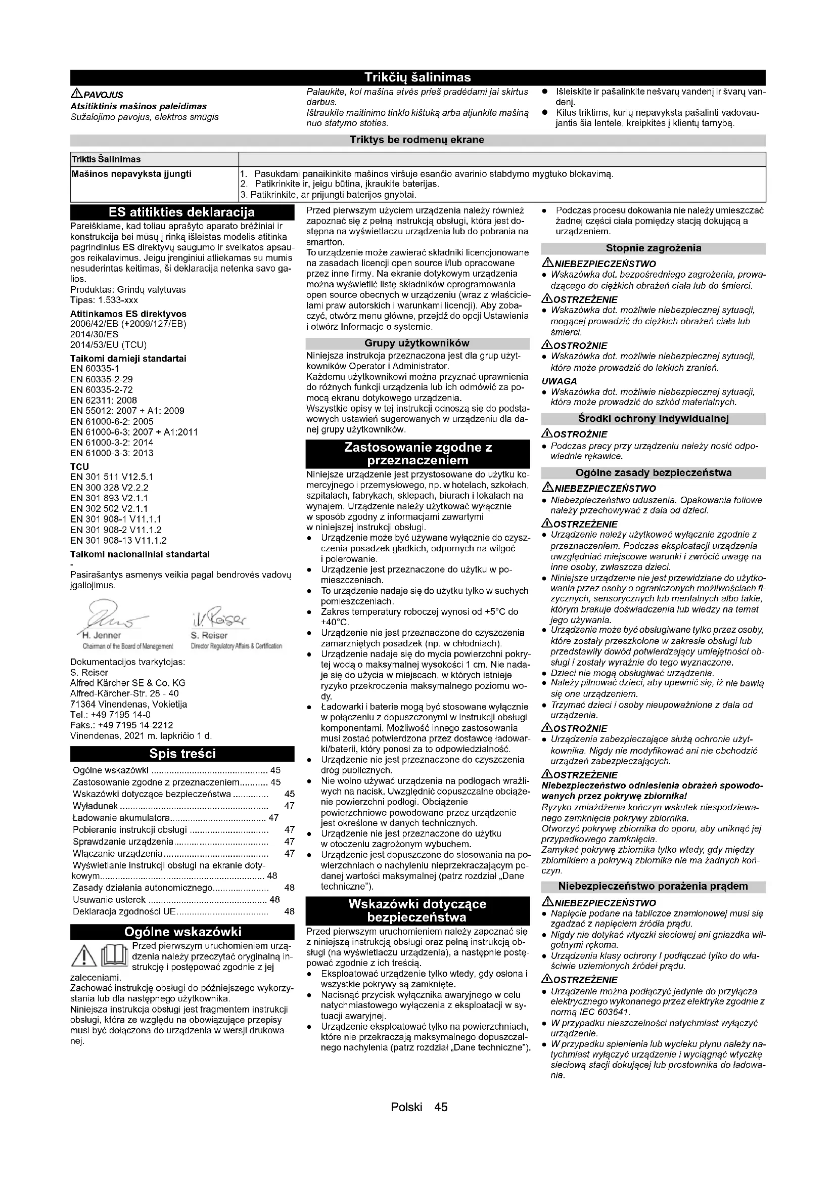 czymi i zwrócić uwagę mokre podłogi. Usuwanie usterek NIEBEZPIECZEŃSTWO Niezamierzone włączenie się urządzenia Niebezpieczeństwo odniesienia obrażeń, porażenia prądem Przed rozpoczęciem prac przy urządzeniu wyłączyć je. Odłączyć wtyczkę sieciową lub odłączyć urządzenie od stacji dokującej. Spuścić i usunąć brudną i czystą wodę. Jeśli usunięcie usterki na podstawie informacji za- wartych w niniejszej tabeli nie będzie możliwe, nale- ży wezwać serwis. Usterki, które nie są sygnalizowane na wyświetlaczu Deklaracja zgodności UE Niniejszym oświadczamy, że określone poniżej urzą- dzenie odpowiada pod względem koncepcji, konstrukcji oraz wprowadzonej przez nas do handlu wersji obowią- zującym zasadniczym wymogom dyrektyw UE dotyczą- cym bezpieczeństwa i zdrowia. Wszelkie nieuzgodnione z nami modyfikacje urządzenia powodu- ją utratę ważności tego oświadczenia. Produkt: urządzenie do czyszczenia podłóg Typ: 1.533-xxx Obowiązujące dyrektywy UE 2006/42/WE (+2009/127/WE) 2014/30/UE 2014/53/EU (TCU) Zastosowane normy zharmonizowane EN 60335-1 EN 60335-2-29 EN 60335-2-72 EN 62311: 2008 EN 55012: 2007 + A1: 2009 EN 61000-6-2: 2005 EN 61000-6-3: 2007 + A1:2011 EN 61000-3-2: 2014 EN 61000-3-3: 2013 TCU EN 301 511 V12.5.1 EN 300 328 V2.2.2 EN 301 893 V2.1.1 EN 302 502 V2.1.1 EN 301 908-1 V11.1.1 EN 301 908-2 V11.1.2 EN 301 908-13 V11.1.2 Zastosowane normy krajowe