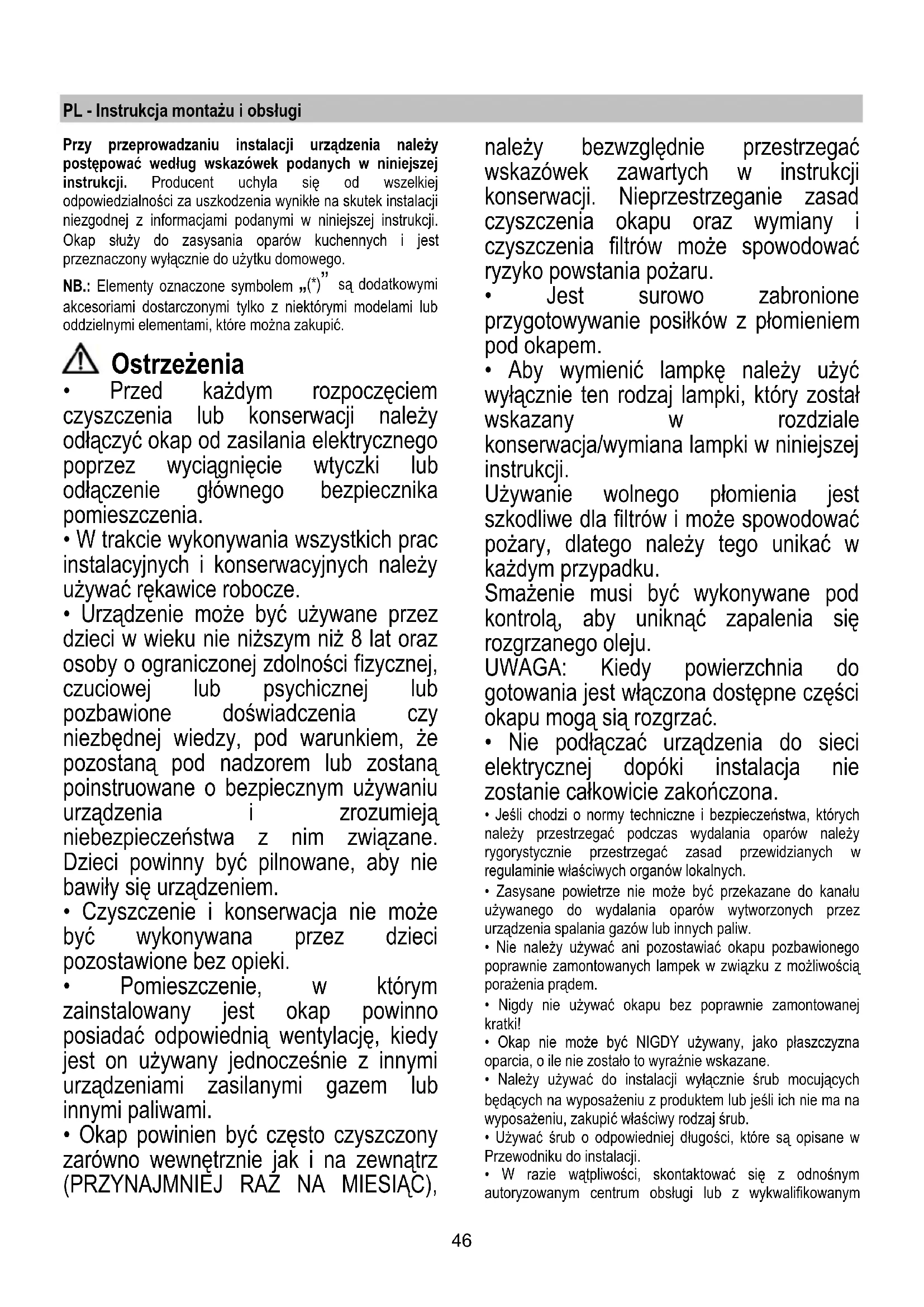 - Okap powinien być często czyszczony zarówno wewnętrznie jak i na zewnątrz (PRZYNAJMNIEJ RAZ NA MIESIĄC), należy bezwzględnie przestrzegać wskazówek zawartych w instrukcji konserwacji. Nieprzestrzeganie zasad czyszczenia okapu oraz wymiany i czyszczenia filtrów może spowodować ryzyko powstania pożaru.