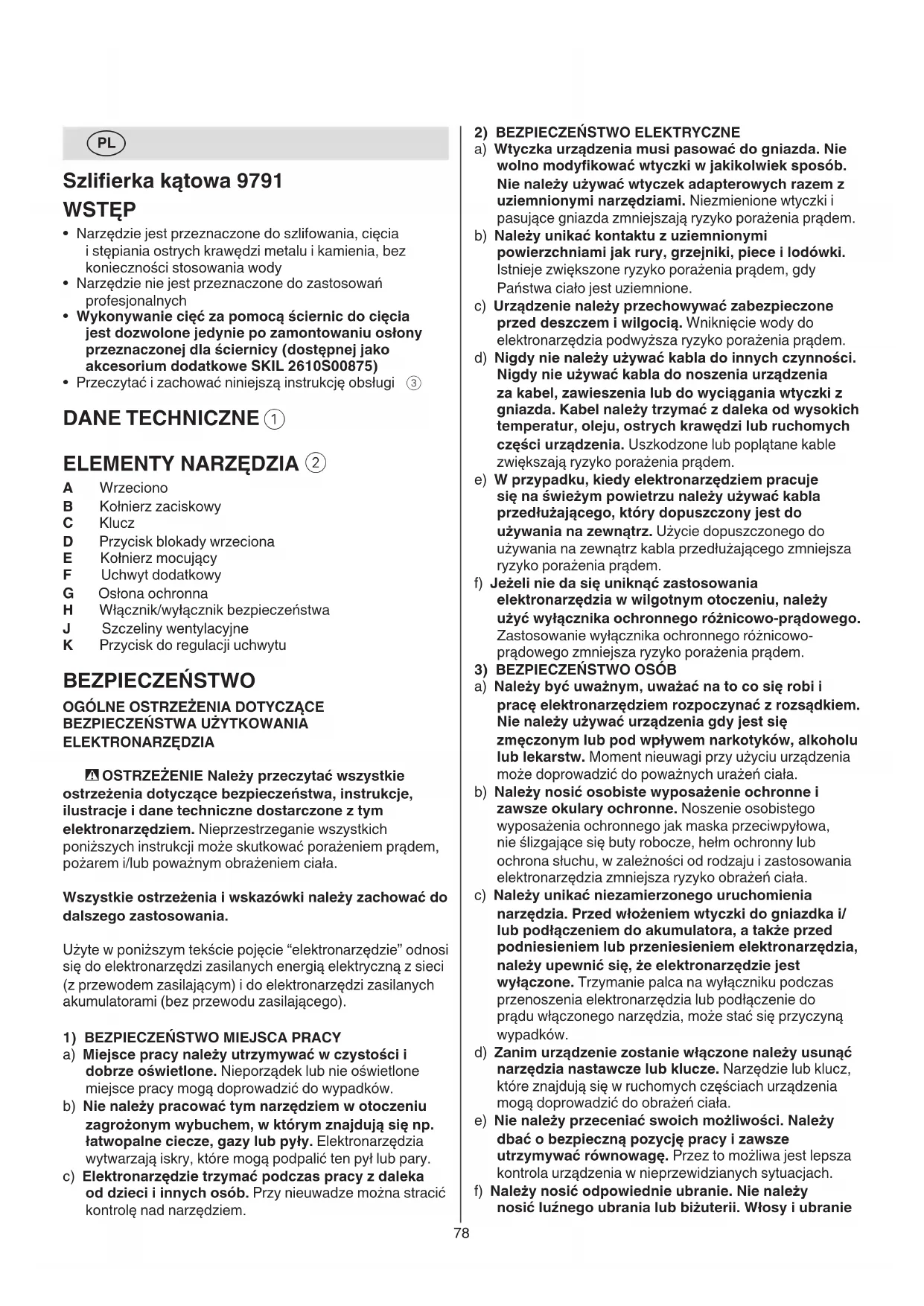 A Wrzeciono B Kołnierz zaciskowy C Klucz D Przycisk blokady wrzeciona E Kołnierz mocujący F Uchwyt dodatkowy G Osłona ochronna H Włącznik/wyłącznik bezpieczeństwa J Szczeliny wentylacyjne K Przycisk do regulacji uchwytu BEZPIECZEŃSTWO