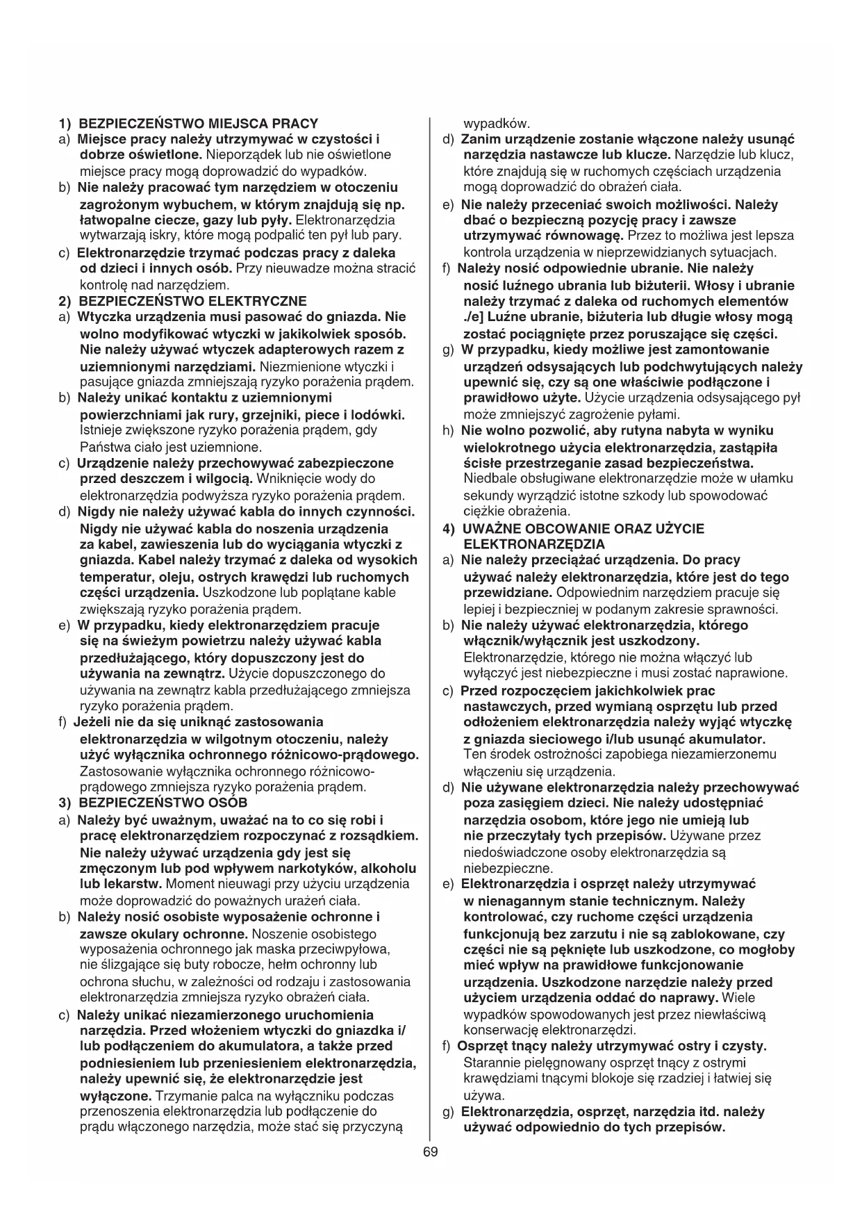 a) Należy być uważnym, uważać na to co się robi i pracę elektronarzędziem rozpoczynać z rozsądkiem. Nie należy używać urządzenia gdy jest się zmęczonym lub pod wpływem narkotyków, alkoholu lub lekarstw. Moment nieuwagi przy użyciu urządzenia może doprowadzić do poważnych urażeń ciała. b) Należy nosić osobiste wyposażenie ochronne i zawsze okulary ochronne. Noszenie osobistego wyposażenia ochronnego jak maska przeciwpyłowa, nie ślizgające się buty robocze, hełm ochronny lub ochrona słuchu, w zależności od rodzaju i zastosowania elektronarzędzia zmniejsza ryzyko obrażeń ciała. c) Należy unikać niezamierzonego uruchomienia narzędzia. Przed włożeniem wtyczki do gniazdka i/ lub podłączeniem do akumulatora, a także przed podniesieniem lub przeniesieniem elektronarzędzia, należy upewnić się, że elektronarzędzie jest wyłączone. Trzymanie palca na wyłączniku podczas przenoszenia elektronarzędzia lub podłączenie do prądu włączonego narzędzia, może stać się przyczyną70