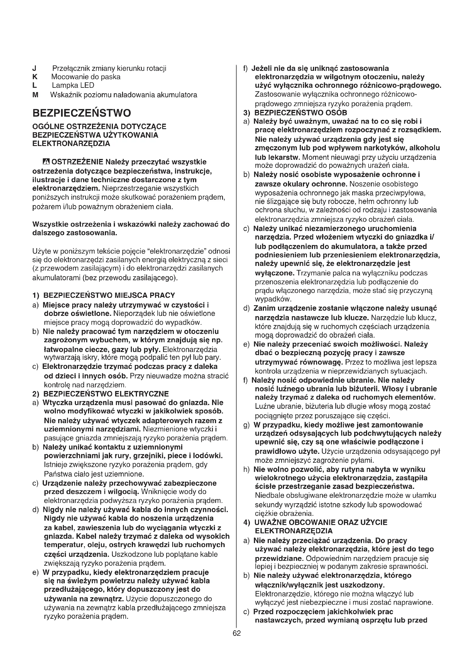ELEKTRONARZĘDZIA a) Nie należy przeciążać urządzenia. Do pracy używać należy elektronarzędzia, które jest do tego przewidziane. Odpowiednim narzędziem pracuje się lepiej i bezpieczniej w podanym zakresie sprawności. b) Nie należy używać elektronarzędzia, którego włącznik/wyłącznik jest uszkodzony. Elektronarzędzie, którego nie można włączyć lub wyłączyć jest niebezpieczne i musi zostać naprawione. c) Przed rozpoczęciem jakichkolwiek prac nastawczych, przed wymianą osprzętu lub przed J Przełącznik zmiany kierunku rotacji K Mocowanie do paska L Lampka LED M Wskaźnik poziomu naładowania akumulatora BEZPIECZEŃSTWO