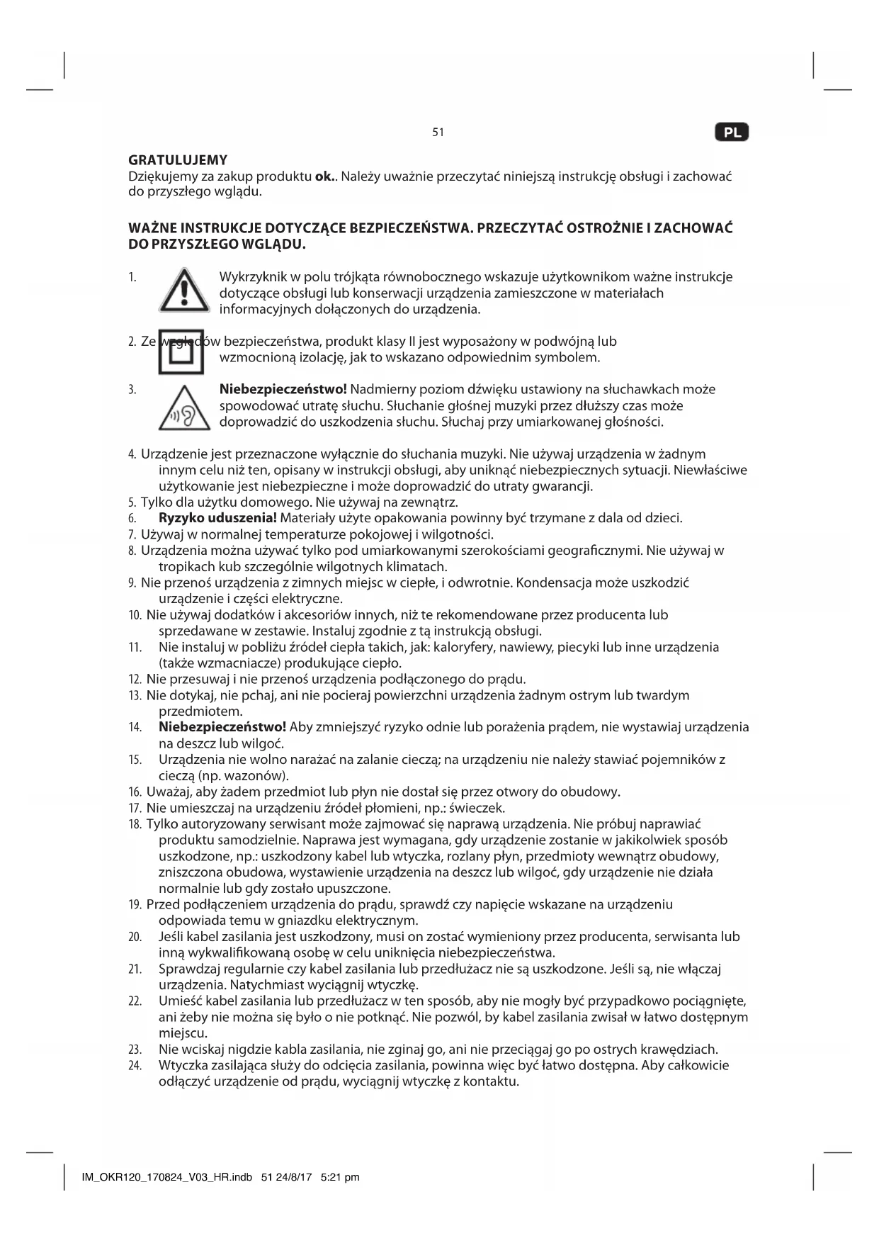 GRATULUJEMY Dziękujemy za zakup produktu ok.. Należy uważnie przeczytać niniejszą instrukcję obsługi i zachować do przyszłego wglądu. WAŻNE INSTRUKCJE DOTYCZĄCE BEZPIECZEŃSTWA. PRZECZYTAĆ OSTROŻNIE I ZACHOWAĆ DO PRZYSZŁEGO WGLĄDU.