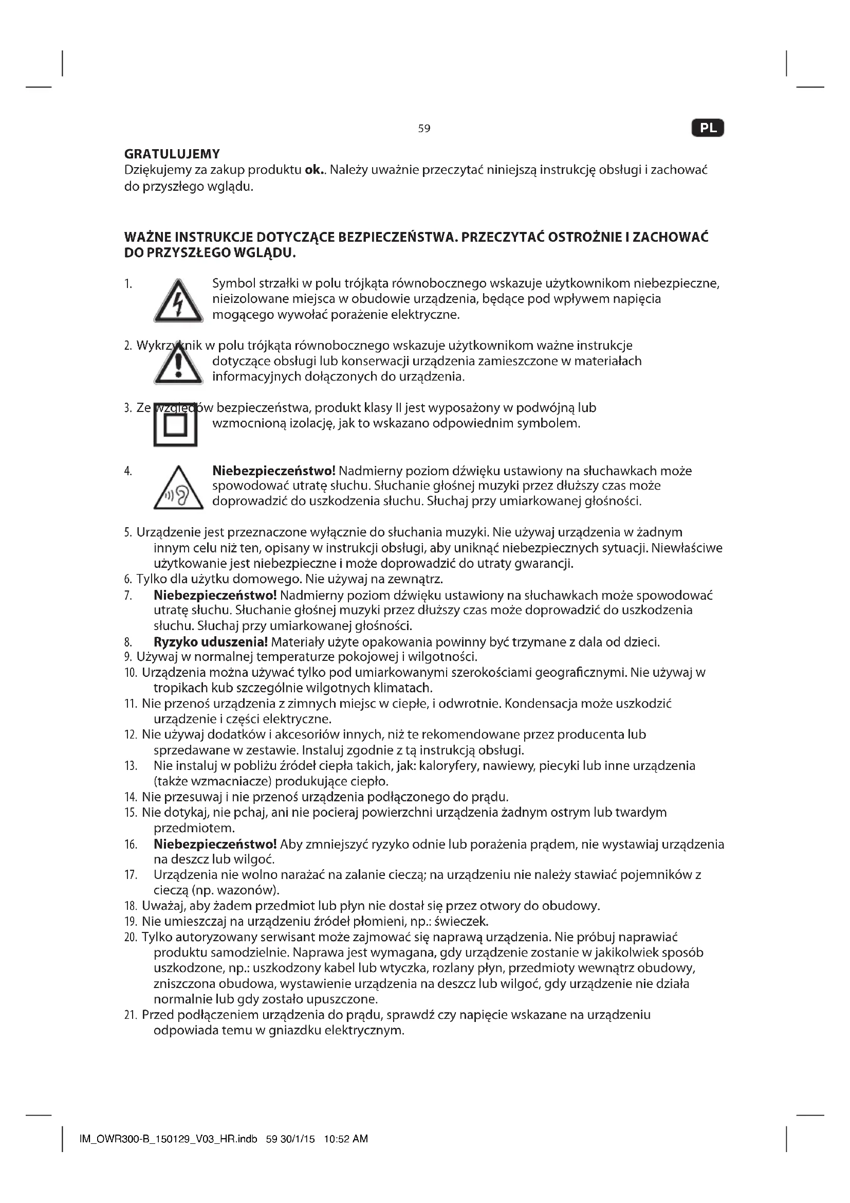 J. H. Przycisk DOSTRAJANIA (TUNE) + K. Regulacja głośności MIN/MAX L. Antena M. Wejście Audio AUX N. Pokrywka komory baterii O. Kabel zasilania z wtyczką PRZED PIERWSZYM UżYCIEM Produkt wraz z wyposażeniem należy ostrożnie wyjąć z oryginalnego opakowania. Zawartość opakowania należy sprawdzić pod względem kompletności i uszkodzeń. W przypadku braku części w opakowaniu lub w razie stwierdzenia uszkodzeń należy skontaktować się z punktem sprzedaży. IM_OWR300-B_150129_V03_HR.indb 61 30/1/15 10:52 AM62
