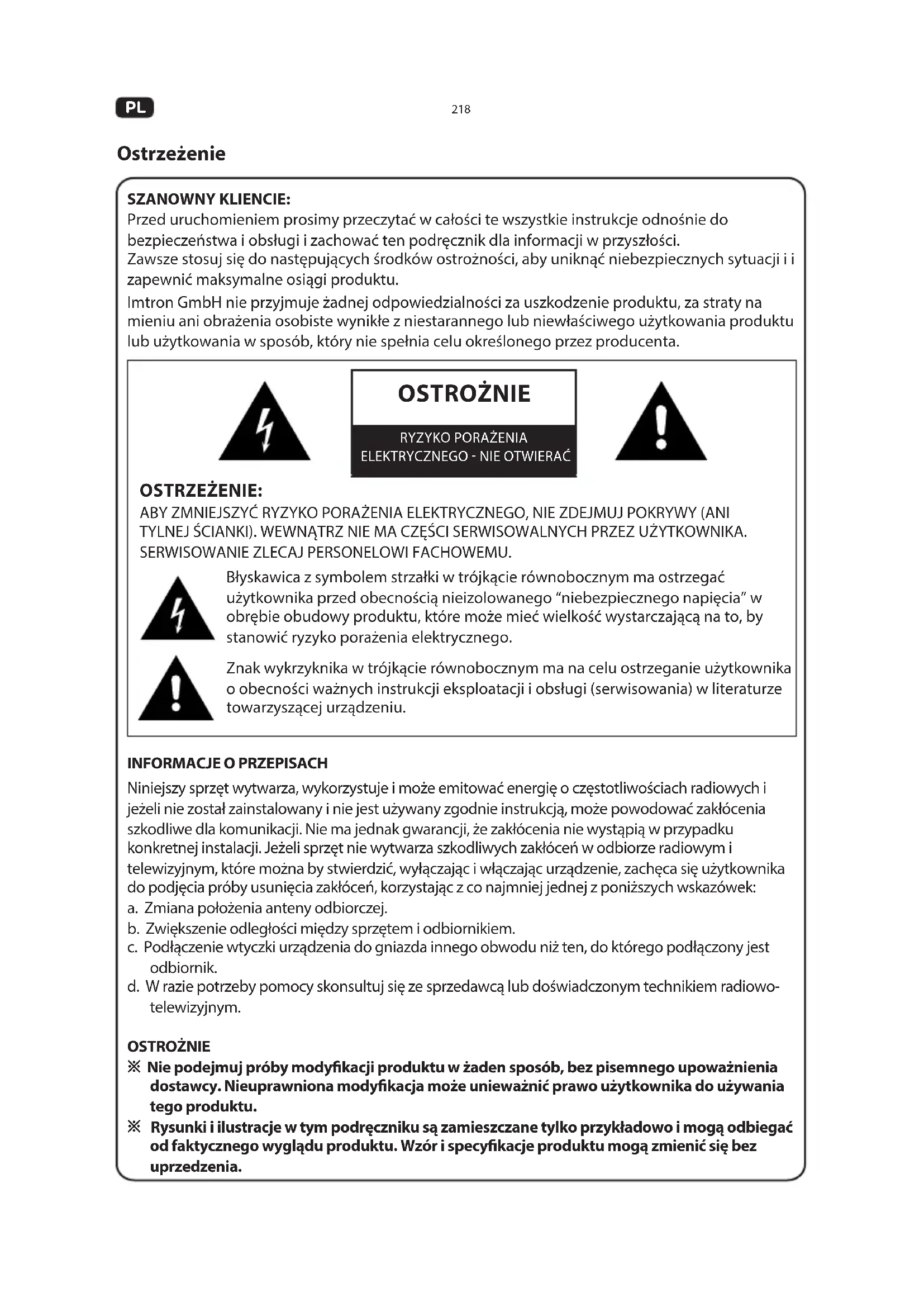 SZANOWNY KLIENCIE: Przed uruchomieniem prosimy przeczytać w całości te wszystkie instrukcje odnośnie do bezpieczeństwa i obsługi i zachować ten podręcznik dla informacji w przyszłości. Zawsze stosuj się do następujących środków ostrożności, aby uniknąć niebezpiecznych sytuacji i i zapewnić maksymalne osiągi produktu. Imtron GmbH nie przyjmuje żadnej odpowiedzialności za uszkodzenie produktu, za straty na mieniu ani obrażenia osobiste wynikłe z niestarannego lub niewłaściwego użytkowania produktu lub użytkowania w sposób, który nie spełnia celu określonego przez producenta. Ostrzeżenie OSTRZEŻENIE: ABY ZMNIEJSZYĆ RYZYKO PORAŻENIA ELEKTRYCZNEGO, NIE ZDEJMUJ POKRYWY (ANI TYLNEJ ŚCIANKI). WEWNĄTRZ NIE MA CZĘŚCI SERWISOWALNYCH PRZEZ UŻYTKOWNIKA. SERWISOWANIE ZLECAJ PERSONELOWI FACHOWEMU. Błyskawica z symbolem strzałki w trójkącie równobocznym ma ostrzegać użytkownika przed obecnością nieizolowanego “niebezpiecznego napięcia” w obrębie obudowy produktu, które może mieć wielkość wystarczającą na to, by stanowić ryzyko porażenia elektrycznego. Znak wykrzyknika w trójkącie równobocznym ma na celu ostrzeganie użytkownika o obecności ważnych instrukcji eksploatacji i obsługi (serwisowania) w literaturze towarzyszącej urządzeniu.