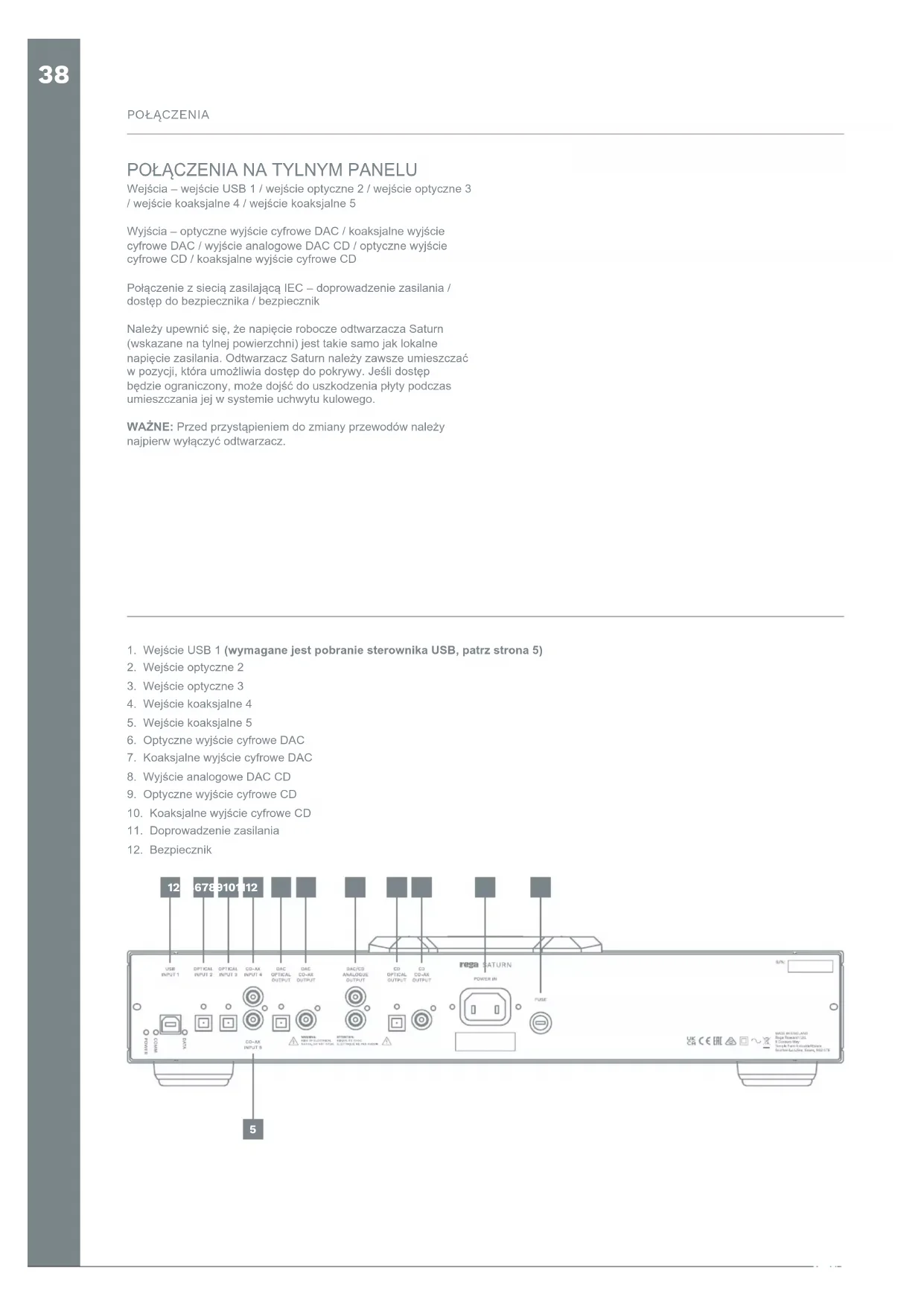 Wejścia – wejście USB 1 / wejście optyczne 2 / wejście optyczne 3 / wejście koaksjalne 4 / wejście koaksjalne 5 Wyjścia – optyczne wyjście cyfrowe DAC / koaksjalne wyjście cyfrowe DAC / wyjście analogowe DAC CD / optyczne wyjście cyfrowe CD / koaksjalne wyjście cyfrowe CD Połączenie z siecią zasilającą IEC – doprowadzenie zasilania / dostęp do bezpiecznika / bezpiecznik Należy upewnić się, że napięcie robocze odtwarzacza Saturn (wskazane na tylnej powierzchni) jest takie samo jak lokalne napięcie zasilania. Odtwarzacz Saturn należy zawsze umieszczać w pozycji, która umożliwia dostęp do pokrywy. Jeśli dostęp będzie ograniczony, może dojść do uszkodzenia płyty podczas umieszczania jej w systemie uchwytu kulowego. WAŻNE: Przed przystąpieniem do zmiany przewodów należy najpierw wyłączyć odtwarzacz.