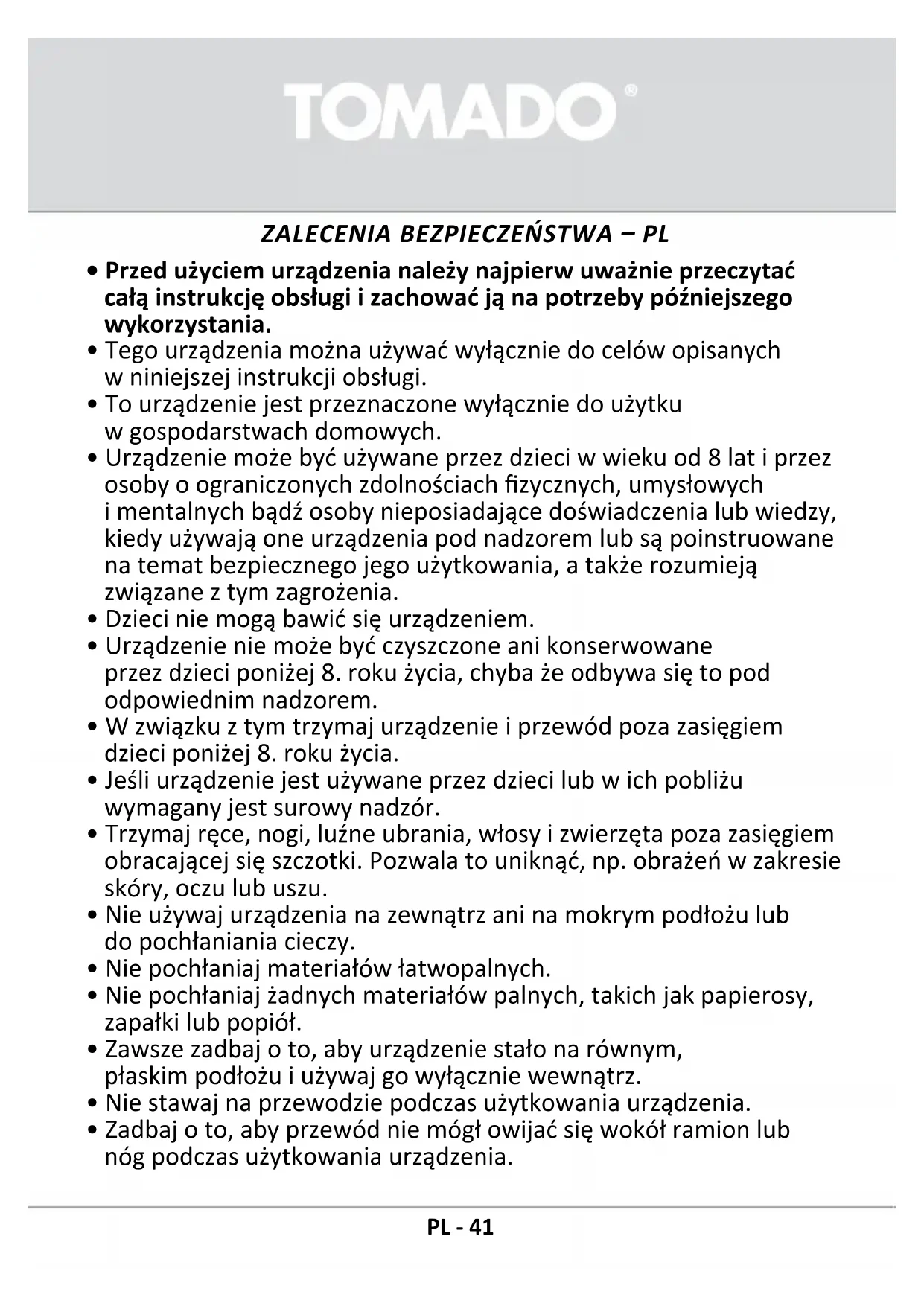 - Korzystaniezakcesoriów,któreniesązalecanelubsprzedawane przezrmęTomado,możedoprowadzićdopożaru,porażenia prądemlubobrażeńciała.