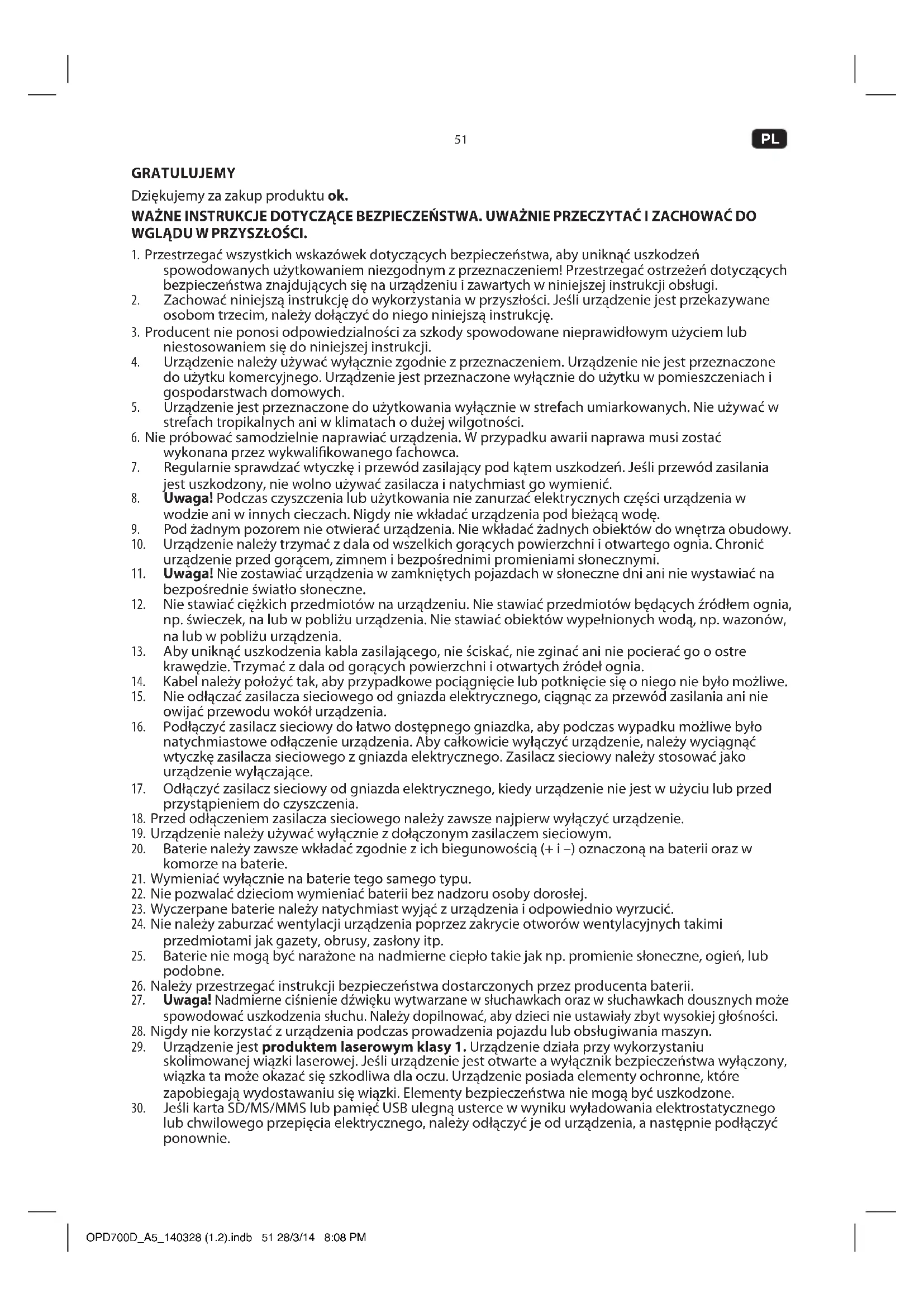 GRATULUJEMY Dziękujemy za zakup produktu ok. WAŻNE INSTRUKCJE DOTYCZĄCE BEZPIECZEŃSTWA. UWAŻNIE PRZECZYTAĆ I ZACHOWAĆ DO WGLĄDU W PRZYSZŁOŚCI.