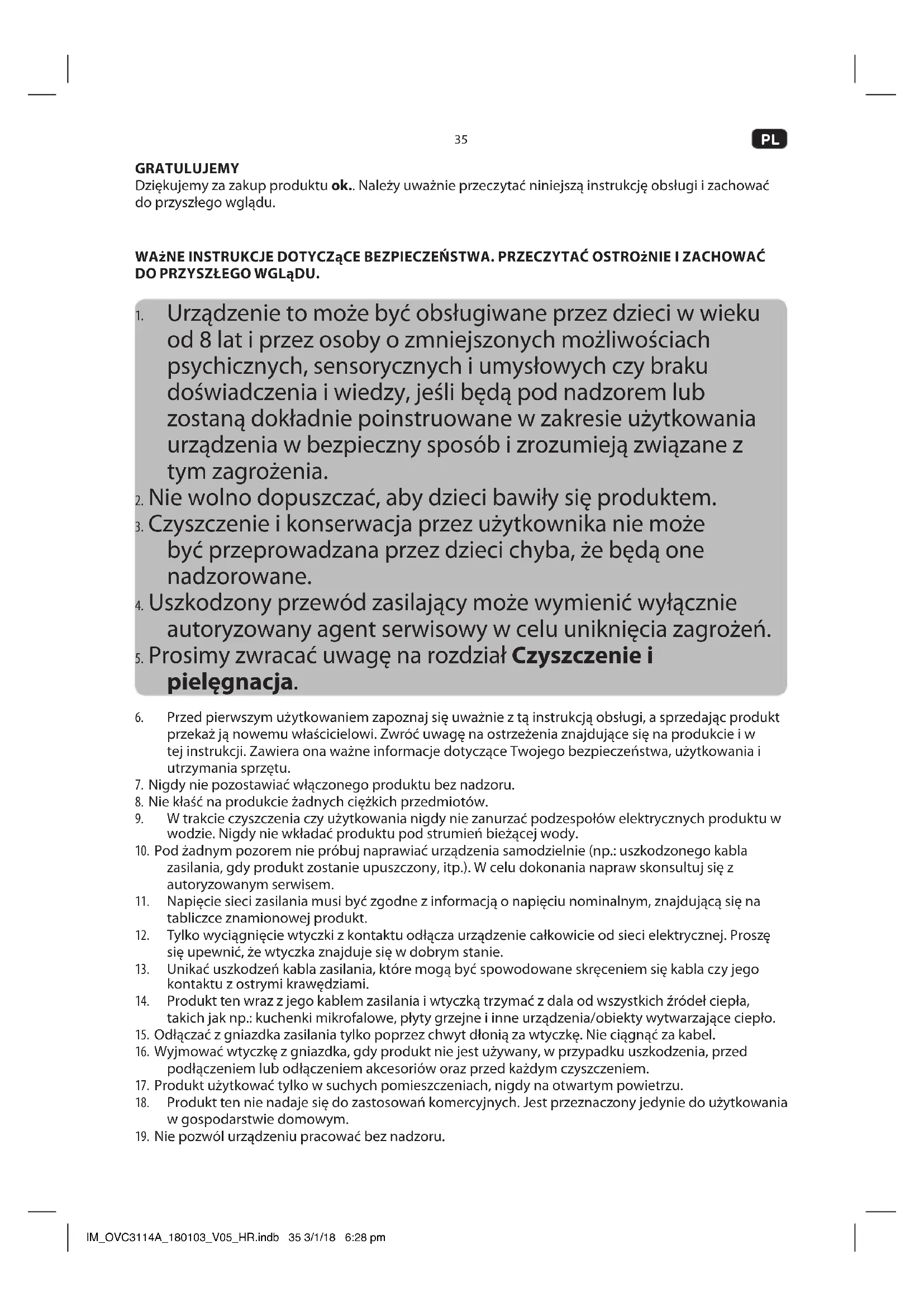 - W celu uzyskania informacji technicznych proszę się zapoznać z poniższą stroną internetową lub skontaktować z wytwórcą, w celu uzyskania dokumentacji technicznej: www.ok-online.com UTYLIZACJA Nie należy wyrzucać tego urządzenia wraz z odpadami domowymi. Zużyty sprzęt należy oddać do wyznaczonego punktu zbiórki sprzętu elektrycznego i elektronicznego. Więcej informacji na ten temat udzielają lokalne władze lub sprzedawca urządzenia. IM_OVC3114A_180103_V05_HR.indb 38 3/1/18 6:28 pm39