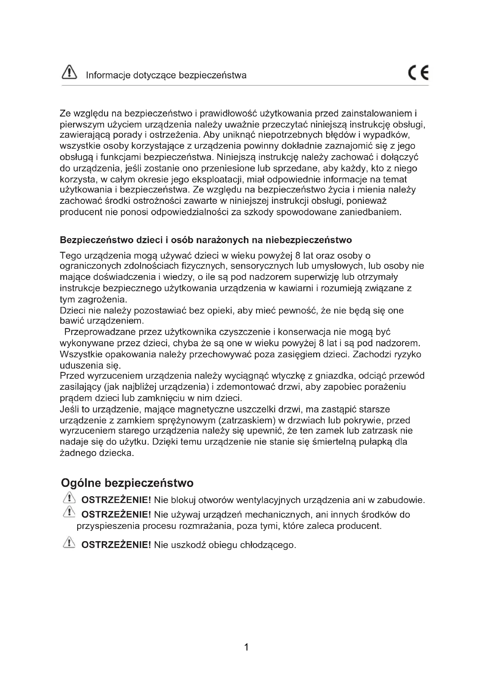 3CF100WN CF200WN CF316WN Zamrażarka Instrukcja obsługi PLInformacje dotyczące bezpieczeństwa Ze względu na bezpieczeństwo i prawidłowość użytkowania przed zainstalowaniem i pierwszym użyciem urządzenia należy uważnie przeczytać niniejszą instrukcję obsługi, zawierającą porady i ostrzeżenia. Aby uniknąć niepotrzebnych błędów i wypadków, wszystkie osoby korzystające z urządzenia powinny dokładnie zaznajomić się z jego obsługą i funkcjami bezpieczeństwa. Niniejszą instrukcję należy zachować i dołączyć do urządzenia, jeśli zostanie ono przeniesione lub sprzedane, aby każdy, kto z niego korzysta, w całym okresie jego eksploatacji, miał odpowiednie informacje na temat użytkowania i bezpieczeństwa. Ze względu na bezpieczeństwo życia i mienia należy zachować środki ostrożności zawarte w niniejszej instrukcji obsługi, ponieważ producent nie ponosi odpowiedzialności za szkody spowodowane zaniedbaniem. Bezpieczeństwo dzieci i osób narażonych na niebezpieczeństwo Tego urządzenia mogą używać dzieci w wieku powyżej 8 lat oraz osoby o ograniczonych zdolnościach fizycznych, sensorycznych lub umysłowych, lub osoby nie mające doświadczenia i wiedzy, o ile są pod nadzorem superwizję lub otrzymały instrukcje bezpiecznego użytkowania urządzenia w kawiarni i rozumieją związane z tym zagrożenia. Dzieci nie należy pozostawiać bez opieki, aby mieć pewność, że nie będą się one bawić urządzeniem. Przeprowadzane przez użytkownika czyszczenie i konserwacja nie mogą być wykonywane przez dzieci, chyba że są one w wieku powyżej 8 lat i są pod nadzorem. Wszystkie opakowania należy przechowywać poza zasięgiem dzieci. Zachodzi ryzyko uduszenia się. Przed wyrzuceniem urządzenia należy wyciągnąć wtyczkę z gniazdka, odciąć przewód zasilający (jak najbliżej urządzenia) i zdemontować drzwi, aby zapobiec porażeniu prądem dzieci lub zamknięciu w nim dzieci. Jeśli to urządzenie, mające magnetyczne uszczelki drzwi, ma zastąpić starsze urządzenie z zamkiem sprężynowym (zatrzaskiem) w drzwiach lub pokrywie, przed wyrzuceniem starego urządzenia należy się upewnić, że ten zamek lub zatrzask nie nadaje się do użytku. Dzięki temu urządzenie nie stanie się śmiertelną pułapką dla żadnego dziecka. Ogólne bezpieczeństwo OSTRZEŻENIE! Nie blokuj otworów wentylacyjnych urządzenia ani w zabudowie. OSTRZEŻENIE! Nie używaj urządzeń mechanicznych, ani innych środków do przyspieszenia procesu rozmrażania, poza tymi, które zaleca producent. OSTRZEŻENIE! Nie uszkodź obiegu chłodzącego.
