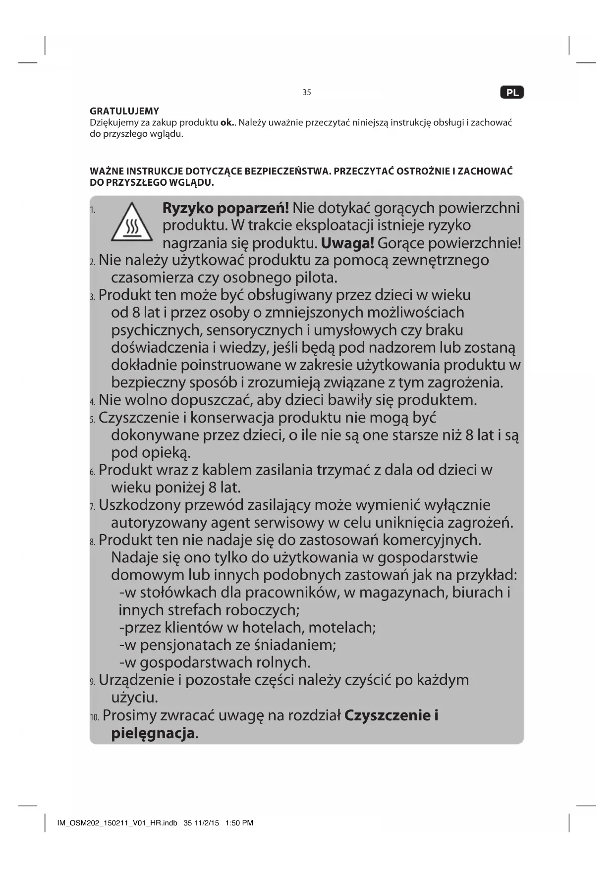PRZEZNACZENIE Urządzenie nadaje się tylko do przygotowywania artykułów spożywczych. Jakikolwiek inny sposób użytkowania może doprowadzić do uszkodzenia urządzenia lub obrażeń. IM_OSM202_150211_V01_HR.indb 36 11/2/15 1:50 PM37