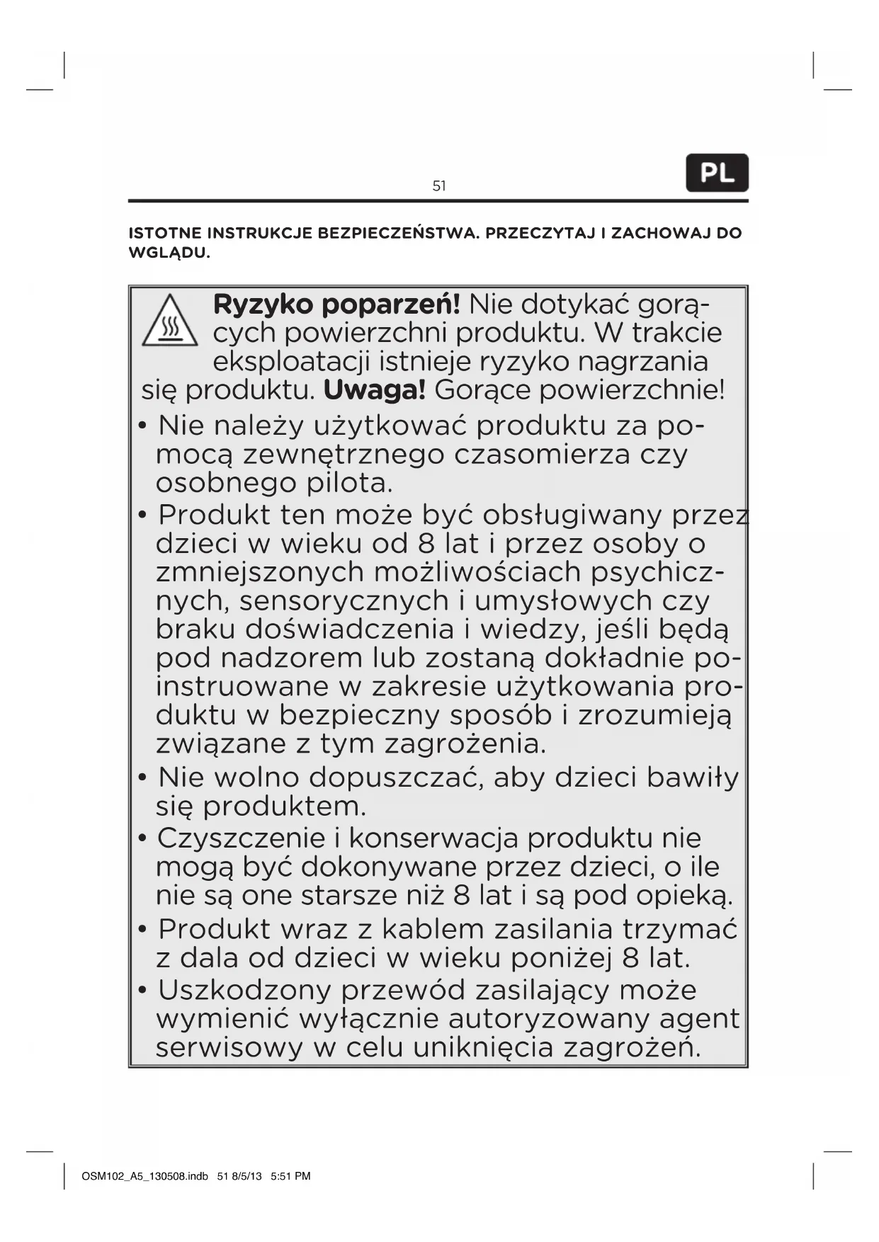 - Przechowuj urządzenie w suchym i chłodnym miejscu nie narażonym na wilgoć i bezpośrednie działanie promieni słonecznych. Przechowuj urządzenie poza zasięgiem dzieci. SPECYFIKACJA TECHNICZNA Napięcie znamionowe: 220–240 V~, 50/60 Hz / Moc znamionowa: 750 W / Klasa ochronności I UTYLIZACJA Nie wyrzucać urządzenia do ogólnego domowego kosza na śmieci. Należy je oddać w specjalnym punkcie zbiórki elektrycznego i elektronicznego przeznaczonego do recyklingu. W ten sposób przyczynią się Państwo do redukcji zużycia zasobów oraz do ochrony środowiska. Aby uzyskać więcej informacji na ten temat, proszę skontaktować się ze sprzedawcą lub odpowiednim urzędem. OSM102_A5_130508.indb 56 8/5/13 5:51 PM57 Size - A5 INSTRUÇÕES IMPORTANTES DE SEGURANÇA. LEIA-AS CUIDADOSAMENTE E CONSERVE-AS PARA FUTURA REFERÊNCIA. Risco de queimadura! Não toque nas superfícies quentes do aparelho. O aparelho emana calor durante o seu funcionamento. Cuidado! Superfície quente!
