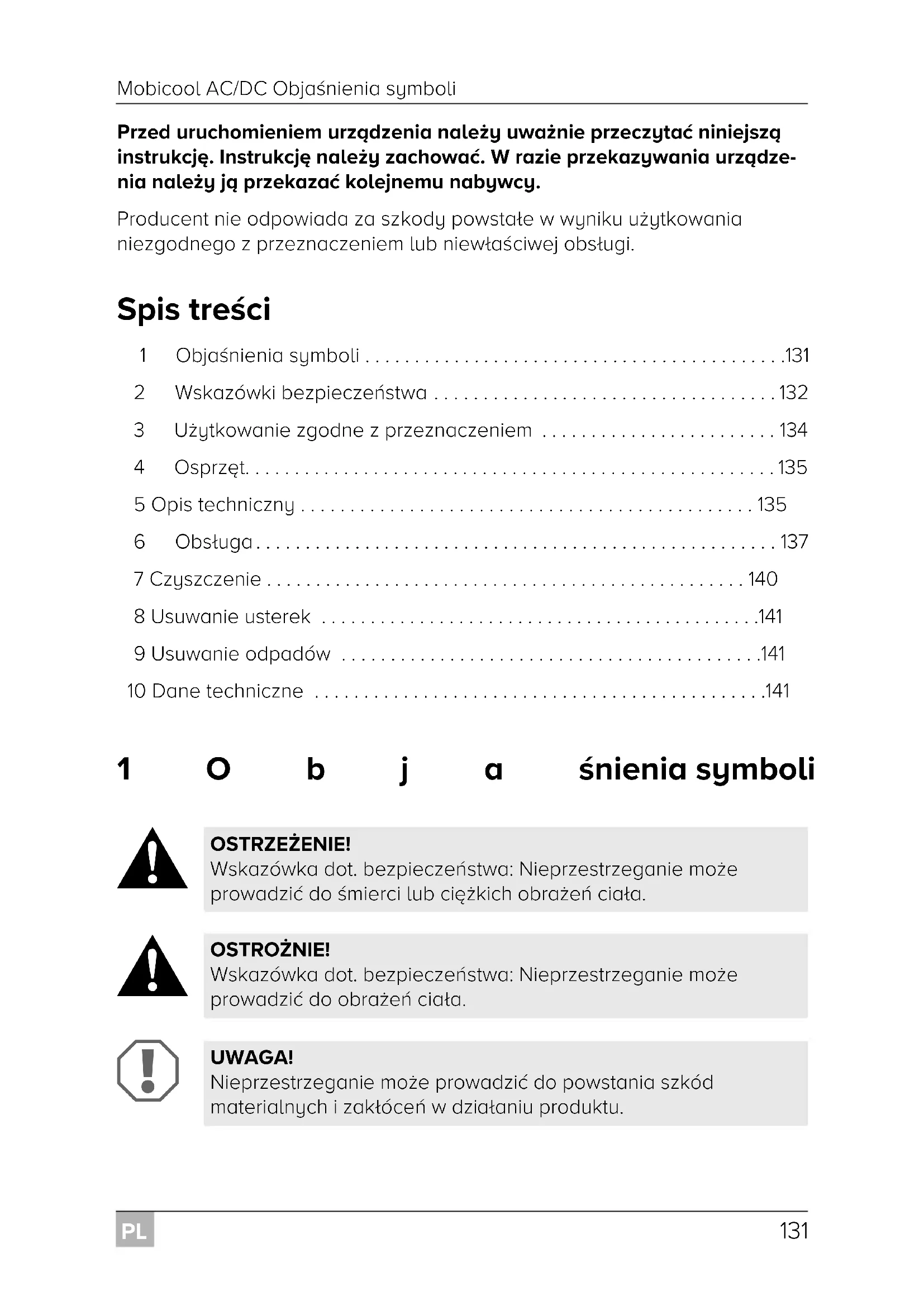 OSTRZEŻENIE! Wskazówka dot. bezpieczeństwa: Nieprzestrzeganie może prowadzić do śmierci lub ciężkich obrażeń ciała. OSTROŻNIE! Wskazówka dot. bezpieczeństwa: Nieprzestrzeganie może prowadzić do obrażeń ciała. UWAGA! Nieprzestrzeganie może prowadzić do powstania szkód materialnych i zakłóceń w działaniu produktu. Mobicool-AC-DC--O-16s.book Seite 131 Montag, 8. Januar 2018 6:11 18PL Wskazówki bezpieczeństwa Mobicool AC/DC