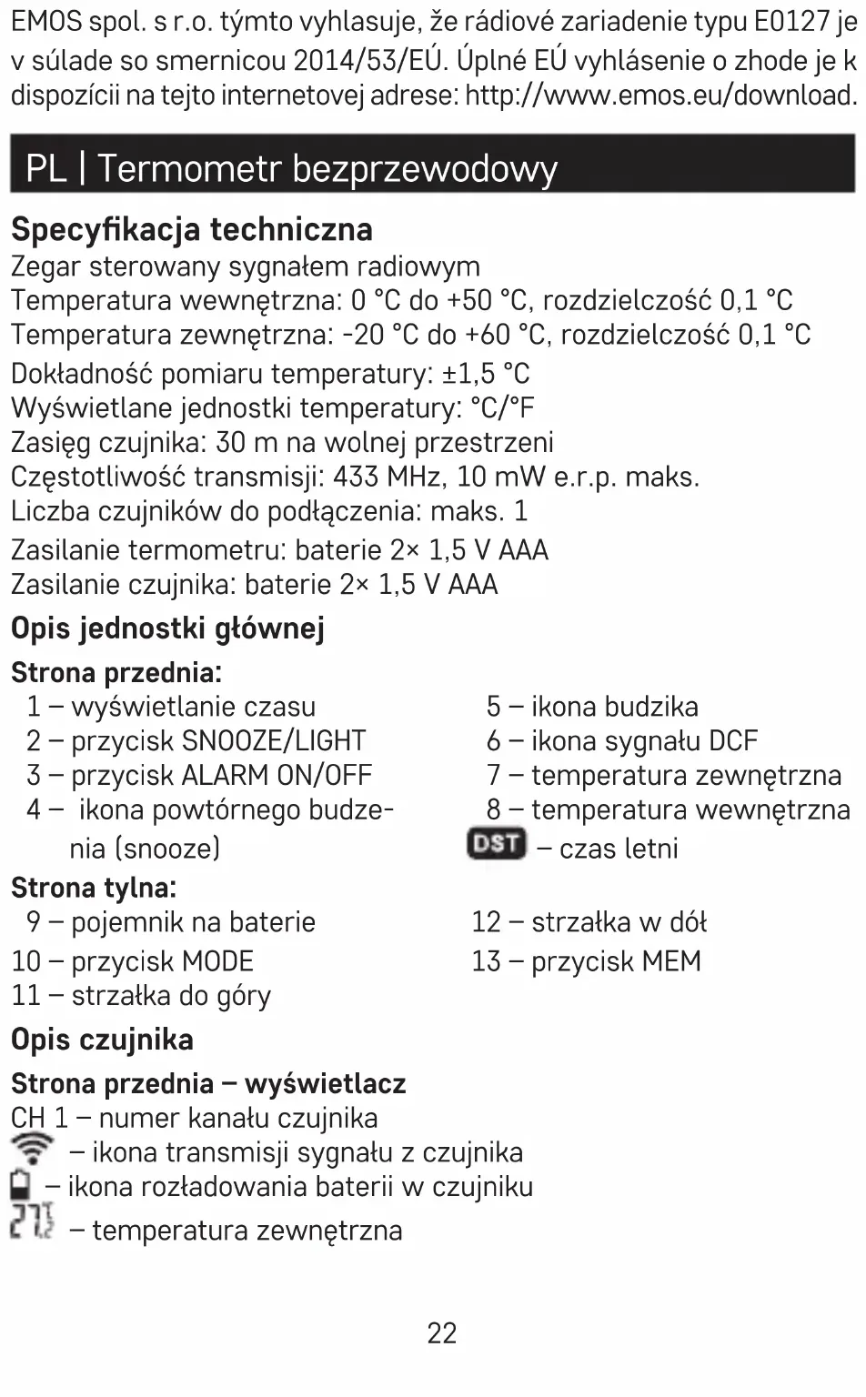 - Žiadna časť návodu nesmie byť reprodukovaná bez písomného povolenia výrobcu.22 EMOS spol. s r.o. týmto vyhlasuje, že rádiové zariadenie typu E0127 je v súlade so smernicou 2014/53/EÚ. Úplné EÚ vyhlásenie o zhode je k dispozícii na tejto internetovej adrese: http://www.emos.eu/download. PL | Termometr bezprzewodowy Specykacja techniczna Zegar sterowany sygnałem radiowym Temperatura wewnętrzna: 0 °C do +50 °C, rozdzielczość 0,1 °C Temperatura zewnętrzna: -20 °C do +60 °C, rozdzielczość 0,1 °C Dokładność pomiaru temperatury: ±1,5 °C Wyświetlane jednostki temperatury: °C/°F Zasięg czujnika: 30 m na wolnej przestrzeni Częstotliwość transmisji: 433 MHz, 10 mW e.r.p. maks. Liczba czujników do podłączenia: maks. 1 Zasilanie termometru: baterie 2× 1,5 V AAA Zasilanie czujnika: baterie 2× 1,5 V AAA Opis jednostki głównej Strona przednia: 1 – wyświetlanie czasu 2 – przycisk SNOOZE/LIGHT 3 – przycisk ALARM ON/OFF 4 – ikona powtórnego budze- nia (snooze) 5 – ikona budzika 6 – ikona sygnału DCF 7 – temperatura zewnętrzna 8 – temperatura wewnętrzna – czas letni Strona tylna: 9 – pojemnik na baterie 10 – przycisk MODE 11 – strzałka do góry 12 – strzałka w dół 13 – przycisk MEM Opis czujnika Strona przednia – wyświetlacz CH 1 – numer kanału czujnika – ikona transmisji sygnału z czujnika – ikona rozładowania baterii w czujniku – temperatura zewnętrzna23 Strona tylna Pojemnik na baterie °C/°F – opcje jednostki temperatury Funkcje przycisków Tryb Tryb standardowy Tryb ustawiania czasu Tryb ustawiania Przycisk termo- metru Naci- śnięcie przycisku Przytrzy- manie wci- śniętego przycisku Naci- śnięcie przycisku Przytrzy- manie wci- śniętego przycisku Naci- śnięcie przycisku Przytrzy- manie wci- śniętego przycisku Mode Wyświetla- nie czasu budzenia, data Ustawienie czasu Potwier- dzenie ustawienia Zmiana jednostki temperatu- ry °C/°F Wyszukiwa- nie sygnału czujnika 1 krok w przód Przyspie- szenie zmiany ustawień 1 krok w przód Przyspie- szenie zmiany ustawień Zmiana jednostki temperatu- ry °C/°F Zał/Wył odbiór DCF 1 krok do tyłu Przyspie- szenie zmiany ustawień 1 krok do tyłu Przyspie- szenie zmiany ustawień MEM Wyświe- tlanie temperatu- ry maks./ min. Kasowanie wartości zmierzo- nych maks./ min. ALARM ON/OFF Włączenie/ wyłączenie budzika Ustawienie budzika Potwier- dzenie ustawień SNOOZE/ LIGHT Podświetlenie wyświetlacza Uruchamiania do pracy