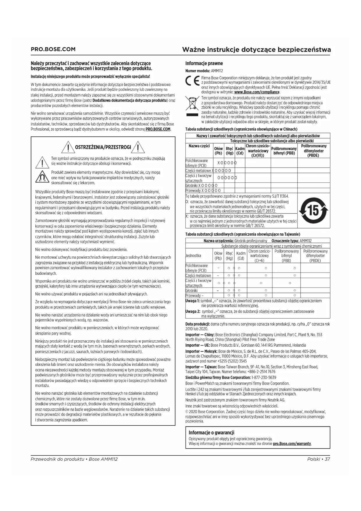 Uwaga 1: symbol „○” oznacza, żezawartość procentowa substancji objętej ograniczeniem nieprzekracza wartości referencyjnej. Uwaga 2: symbol „−” oznacza, żedosubstancji objętej ograniczeniem zastosowanie mawyłączenie. Data produkcji: ósma cyfra numeru seryjnego oznacza rok produkcji, np. cyfra „0” oznacza rok 2010 lub 2020. Importer — Chiny: Bose Electronics (Shanghai) Company Limited, Part C, Plant 9, No. 353 North Riying Road, China (Shanghai) Pilot Free Trade Zone Importer — UE: Bose Products B.V., Gorslaan 60, 1441 RG Purmerend, Holandia Importer — Meksyk: Bose de México, S. de R.L. de C.V., Paseo de las Palmas 405-204, Lomasde Chapultepec, 11000 México, D.F. Aby uzyskać informacje o usługach lub importerze, zadzwoń pod numer +5255 (5202) 3545 Importer — Tajwan: Bose Taiwan Branch, 9F-A1, No.10, Section 3, Minsheng East Road, TaipeiCity 104, Tajwan. Numer telefonu: +886-2-2514 7676 Siedziba główna firmy Bose Corporation: 1-877-230-5639 Bose i PowerMatch są znakami towarowymi firmy Bose Corporation. Loctite i 242 są znakami towarowymi i/lub zarejestrowanymi znakami towarowymi firmy Henkel i/lub jej oddziałów w Stanach Zjednoczonych oraz innych krajach. Neutrik jest zastrzeżonym znakiem towarowym firmy Neutrik AG. Inne znaki towarowe są własnością odpowiednich właścicieli. ©2020 Bose Corporation. Żadnej części tego dzieła niewolno reprodukować, modyfikować, rozpowszechniać ani winny sposób wykorzystywać bez uprzedniego uzyskania pisemnego pozwolenia. Informacje ogwarancji Opisywany produkt objęty jest ograniczoną gwarancją. Więcej informacji o gwarancji można znaleźć na stronie pro.Bose.com/warranty.