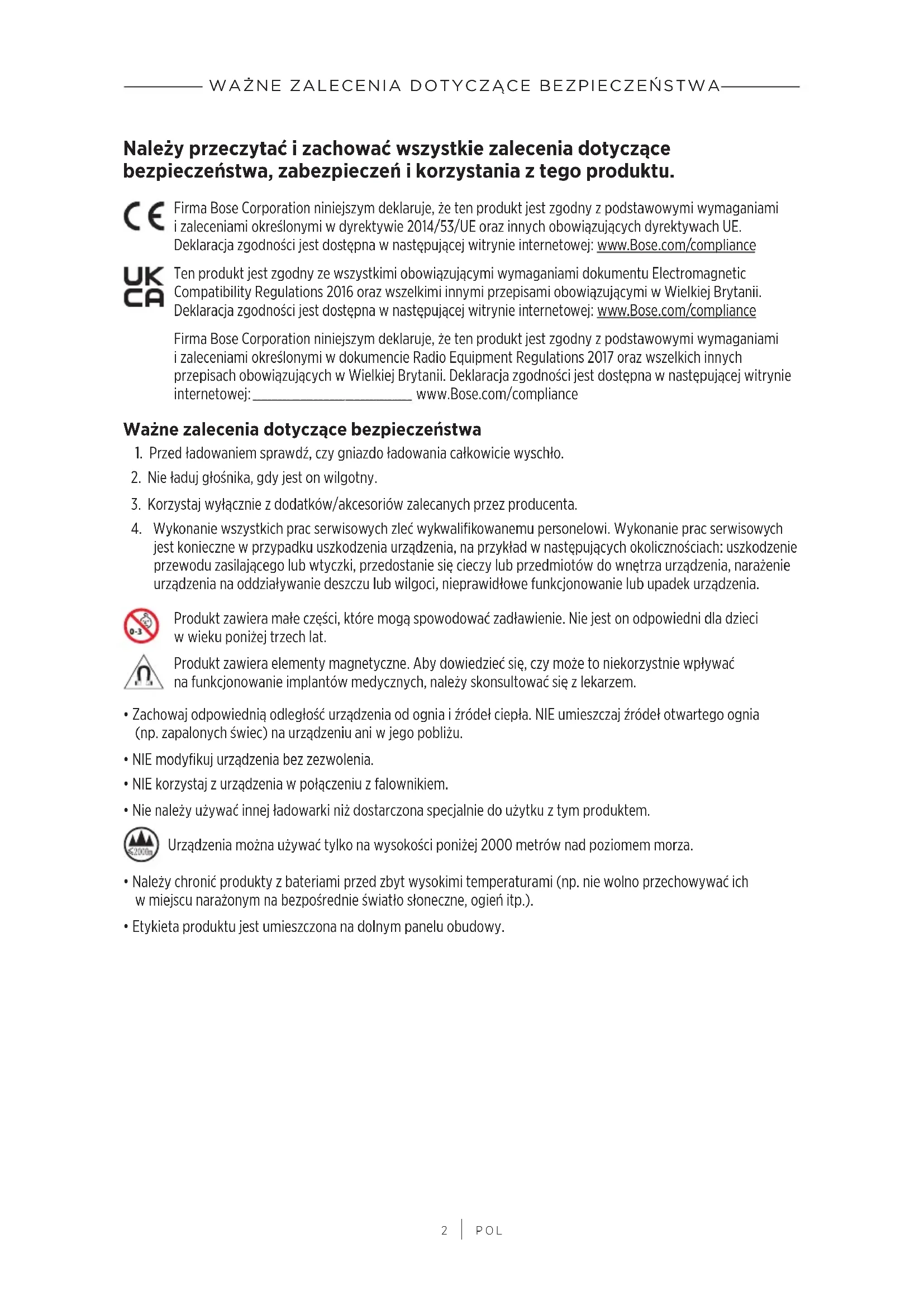 POL Należy przeczytać izachować wszystkie zalecenia dotyczące bezpieczeństwa, zabezpieczeń ikorzystania ztego produktu. Firma Bose Corporation niniejszym deklaruje, żeten produkt jest zgodny zpodstawowymi wymaganiami izaleceniami określonymi wdyrektywie 2014/53/UE oraz innych obowiązujących dyrektywachUE. Deklaracjazgodności jest dostępna wnastępującej witrynie internetowej: www.Bose.com/compliancewww.Bose.com/compliance Ten produkt jest zgodny zewszystkimi obowiązującymi wymaganiami dokumentu Electromagnetic Compatibility Regulations 2016 oraz wszelkimi innymi przepisami obowiązującymi wWielkiej Brytanii. Deklaracja zgodności jest dostępna wnastępującej witrynie internetowej: www.Bose.com/compliancewww.Bose.com/compliance Firma Bose Corporation niniejszym deklaruje, że ten produkt jest zgodny zpodstawowymi wymaganiami izaleceniami określonymi wdokumencie Radio Equipment Regulations 2017 oraz wszelkich innych przepisach obowiązujących wWielkiej Brytanii. Deklaracja zgodności jest dostępna wnastępującej witrynie internetowej: www.Bose.com/compliancewww.Bose.com/compliance Ważne zalecenia dotyczące bezpieczeństwa