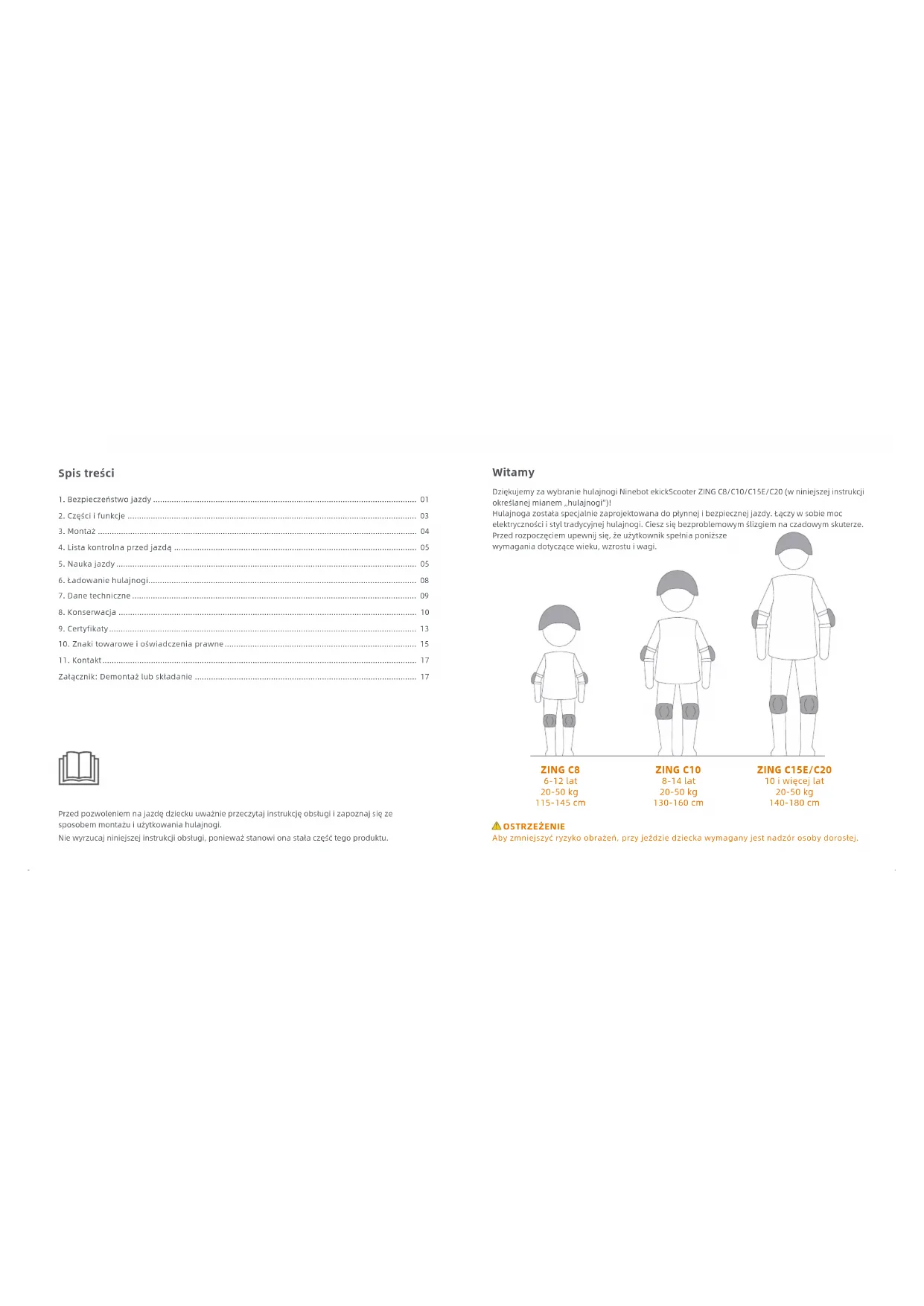 Instrukcja obsługiOSTRZEŻENIE Aby zmniejszyć ryzyko obrażeń, przy jeździe dziecka wymagany jest nadzór osoby dorosłej. Dziękujemy za wybranie hulajnogi Ninebot ekickScooter ZING C8/C10/C15E/C20 (w niniejszej instrukcji określanej mianem „hulajnogi“)! Hulajnoga została specjalnie zaprojektowana do płynnej i bezpiecznej jazdy. Łączy w sobie moc elektryczności i styl tradycyjnej hulajnogi. Ciesz się bezproblemowym ślizgiem na czadowym skuterze. Przed rozpoczęciem upewnij się, że użytkownik spełnia poniższe wymagania dotyczące wieku, wzrostu i wagi. Przed pozwoleniem na jazdę dziecku uważnie przeczytaj instrukcję obsługi i zapoznaj się ze sposobem montażu i użytkowania hulajnogi. Nie wyrzucaj niniejszej instrukcji obsługi, ponieważ stanowi ona stała część tego produktu. Spis treści ZING C8 6-12 lat 20-50 kg 115-145 cm ZING C10 8-14 lat 20-50 kg 130-160 cm