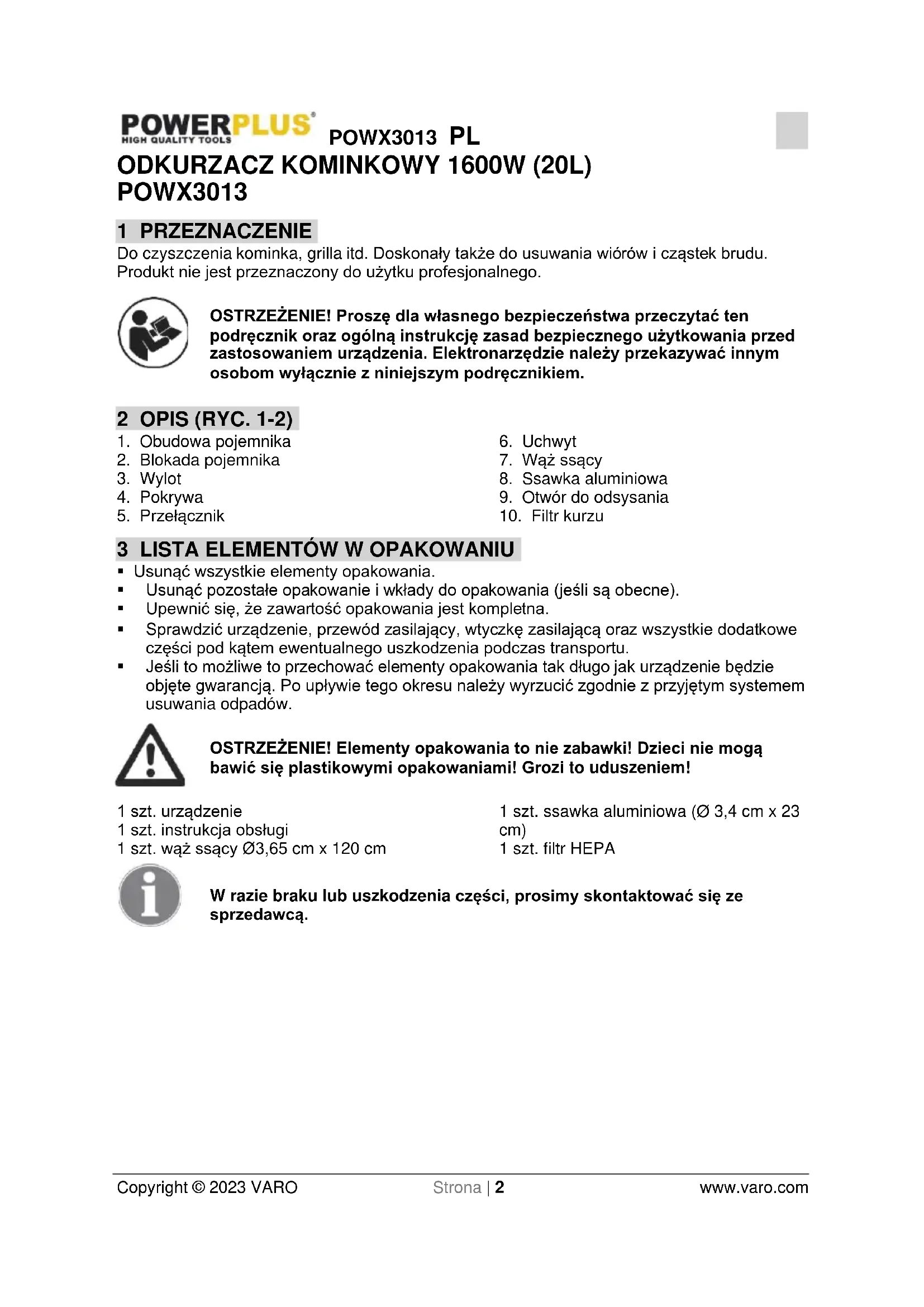 Copyright © 2023 VARO Strona | 2 www.varo.com ODKURZACZ KOMINKOWY 1600W (20L) POWX3013 1 PRZEZNACZENIE Do czyszczenia kominka, grilla itd. Doskonały także do usuwania wiórów i cząstek brudu. Produkt nie jest przeznaczony do użytku profesjonalnego. OSTRZEŻENIE! Proszę dla własnego bezpieczeństwa przeczytać ten podręcznik oraz ogólną instrukcję zasad bezpiecznego użytkowania przed zastosowaniem urządzenia. Elektronarzędzie należy przekazywać innym osobom wyłącznie z niniejszym podręcznikiem. 2 OPIS (RYC. 1-2)