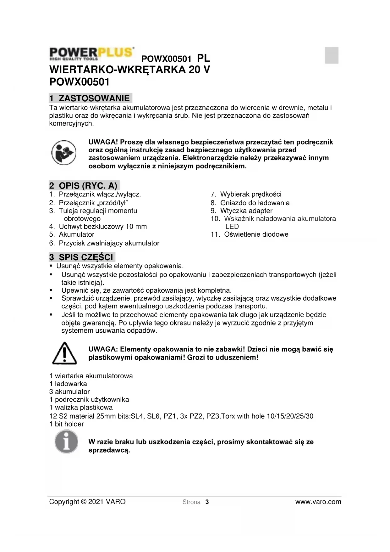 - Jeśli to możliwe to przechować elementy opakowania tak długo jak urządzenie będzie objęte gwarancją. Po upływie tego okresu należy je wyrzucić zgodnie z przyjętym systemem usuwania odpadów. UWAGA: Elementy opakowania to nie zabawki! Dzieci nie mogą bawić się plastikowymi opakowaniami! Grozi to uduszeniem! 1 wiertarka akumulatorowa 1 ładowarka 3 akumulator 1 podręcznik użytkownika 1 walizka plastikowa 12 S2 material 25mm bits:SL4, SL6, PZ1, 3x PZ2, PZ3,Torx with hole 10/15/20/25/30 1 bit holder W razie braku lub uszkodzenia części, prosimy skontaktować się ze sprzedawcą.POWX00501 PL Copyright © 2021 VARO Strona | 4 www.varo.com 4 OZNACZENIA W niniejszej instrukcji i/lub na urządzeniu użyto następujących symboli: