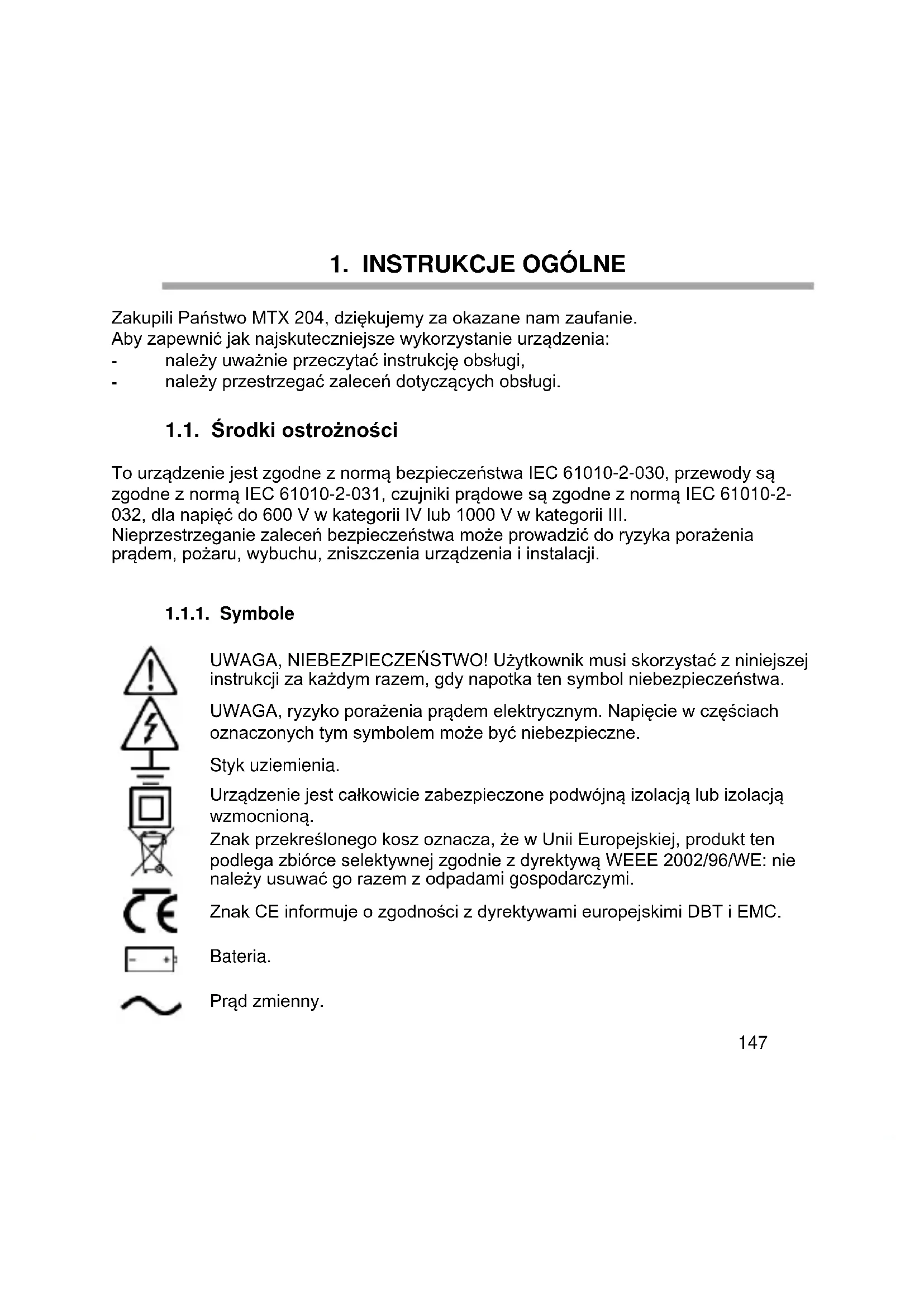 Zakupili Państwo MTX 204, dziękujemy za okazane nam zaufanie. Aby zapewnić jak najskuteczniejsze wykorzystanie urządzenia: - należy uważnie przeczytać instrukcję obsługi, - należy przestrzegać zaleceń dotyczących obsługi. 1.1. Środki ostrożności To urządzenie jest zgodne z normą bezpieczeństwa IEC 61010-2-030, przewody są zgodne z normą IEC 61010-2-031, czujniki prądowe są zgodne z normą IEC 61010-2- 032, dla napięć do 600 V w kategorii IV lub 1000 V w kategorii III. Nieprzestrzeganie zaleceń bezpieczeństwa może prowadzić do ryzyka porażenia prądem, pożaru, wybuchu, zniszczenia urządzenia i instalacji.