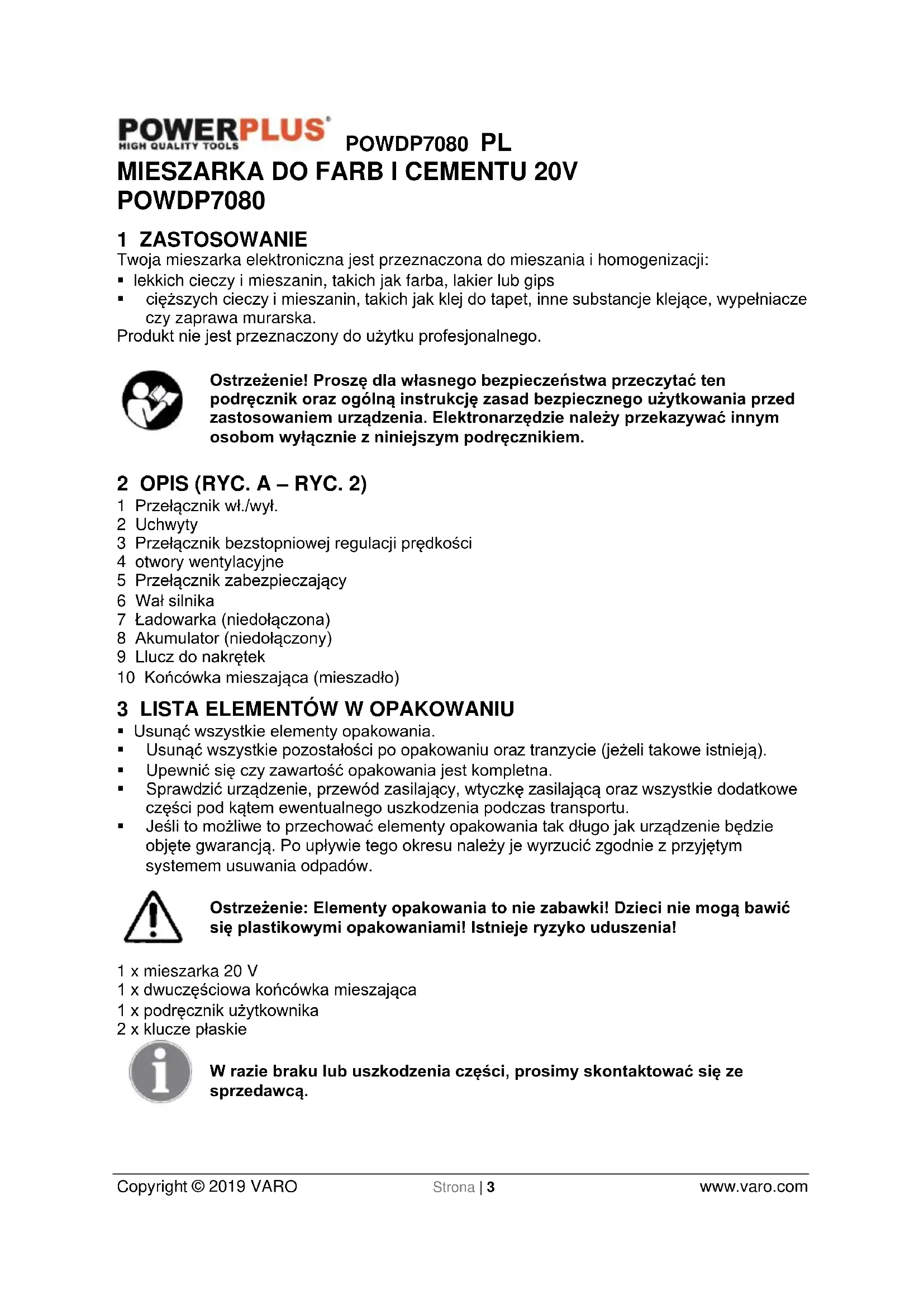 VARO N.V. - Joseph Van Instraat 9 - BE2500 Lier - BELGIA oświadcza, że produkt: MIESZARKA DO FARB I CEMENTU 20 V znak towarowy: POWERplus model: POWDP7080 spełnia niezbędne wymogi i inne stosowne postanowienia odpowiednich dyrektyw europejskich, opierając się na stosowaniu europejskich norm zharmonizowanych. Wszelkie nieuprawnione modyfikacje urządzenia spowodują unieważnienie niniejszej deklaracji. Dyrektywy europejskie (wraz z wszelkimi dyrektywami je zmieniającymi, aż do dnia podpisania): 2011/65/EU 2006/42/EC 2014/30/EU Europejskie normy zharmonizowane (wraz z wszelkimi dyrektywami je zmieniającymi, aż do dnia podpisania): EN62841-1 : 2015 EN62841-2-10 : 2017 EN55014-1 : 2017 EN55014-2 : 2015 Osoba odpowiedzialna za przechowywanie dokumentacji technicznej: Philippe Vankerkhove, VARO – Vic. Van Rompuy N.V. Niżej podpisany/a działa w imieniu Dyrektora Naczelnego firmy, Hugo Cuypers Regulatory Affairs – Compliance Manager Lier, 31/10/2018POWDP7080 HU Copyright © 2019 VARO NV O l d a l | 1 www.varo.com 1 BERENDEZÉS ................................................................................ 3