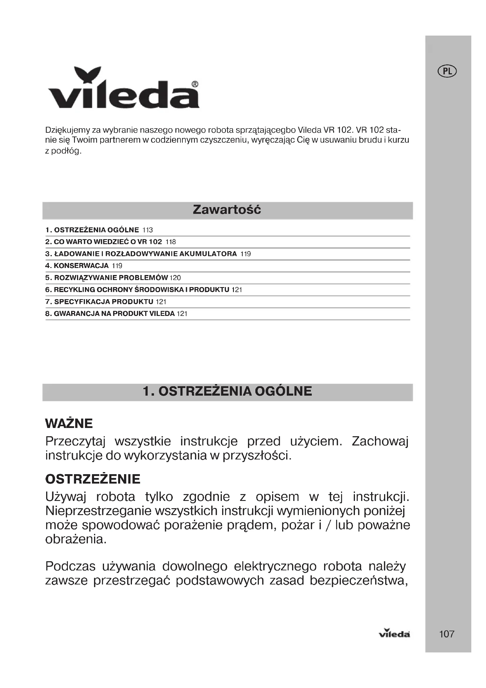 WAŻNE Przeczytaj wszystkie instrukcje przed użyciem. Zachowaj instrukcje do wykorzystania w przyszłości. OSTRZEŻENIE Używaj robota tylko zgodnie z opisem w tej instrukcji. Nieprzestrzeganie wszystkich instrukcji wymienionych poniżej może spowodować porażenie prądem, pożar i / lub poważne obrażenia. Podczas używania dowolnego elektrycznego robota należy zawsze przestrzegać podstawowych zasad bezpieczeństwa, Dziękujemy za wybranie naszego nowego robota sprzątającegbo Vileda VR 102. VR 102 sta- nie się Twoim partnerem w codziennym czyszczeniu, wyręczając Cię w usuwaniu brudu i kurzu z podłóg. Zawartość 1. OSTRZEŻENIA OGÓLNE 1132. CO WARTO WIEDZIEĆ O VR 102 1183. ŁADOWANIE I ROZŁADOWYWANIE AKUMULATORA 1194. KONSERWACJA 1195. ROZWIĄZYWANIE PROBLEMÓW 12 06. RECYKLING OCHRONY ŚRODOWISKA I PRODUKTU 1217. SPECYFIKACJA PRODUKTU 1218. GWARANCJA NA PRODUKT VILEDA 121108
