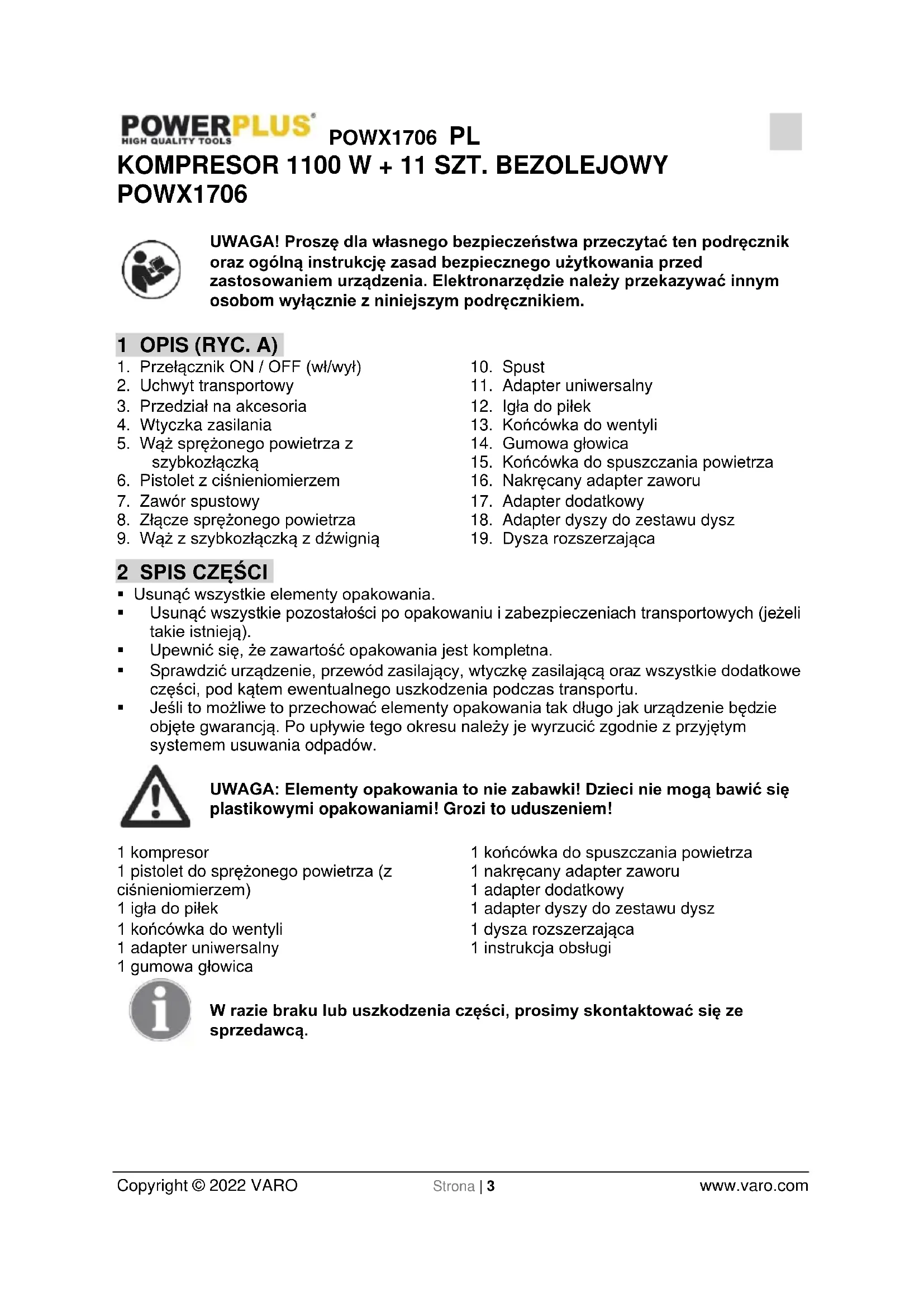 - Jeśli to możliwe to przechować elementy opakowania tak długo jak urządzenie będzie objęte gwarancją. Po upływie tego okresu należy je wyrzucić zgodnie z przyjętym systemem usuwania odpadów. UWAGA: Elementy opakowania to nie zabawki! Dzieci nie mogą bawić się plastikowymi opakowaniami! Grozi to uduszeniem! 1 kompresor 1 pistolet do sprężonego powietrza (z ciśnieniomierzem) 1 igła do piłek 1 końcówka do wentyli 1 adapter uniwersalny 1 gumowa głowica 1 końcówka do spuszczania powietrza 1 nakręcany adapter zaworu 1 adapter dodatkowy 1 adapter dyszy do zestawu dysz 1 dysza rozszerzająca 1 instrukcja obsługi W razie braku lub uszkodzenia części, prosimy skontaktować się ze sprzedawcą.POWX1706 PL Copyright © 2022 VARO Strona | 4 www.varo.com 3 OZNACZENIA W niniejszej instrukcji i/lub na urządzeniu użyto następujących symboli: