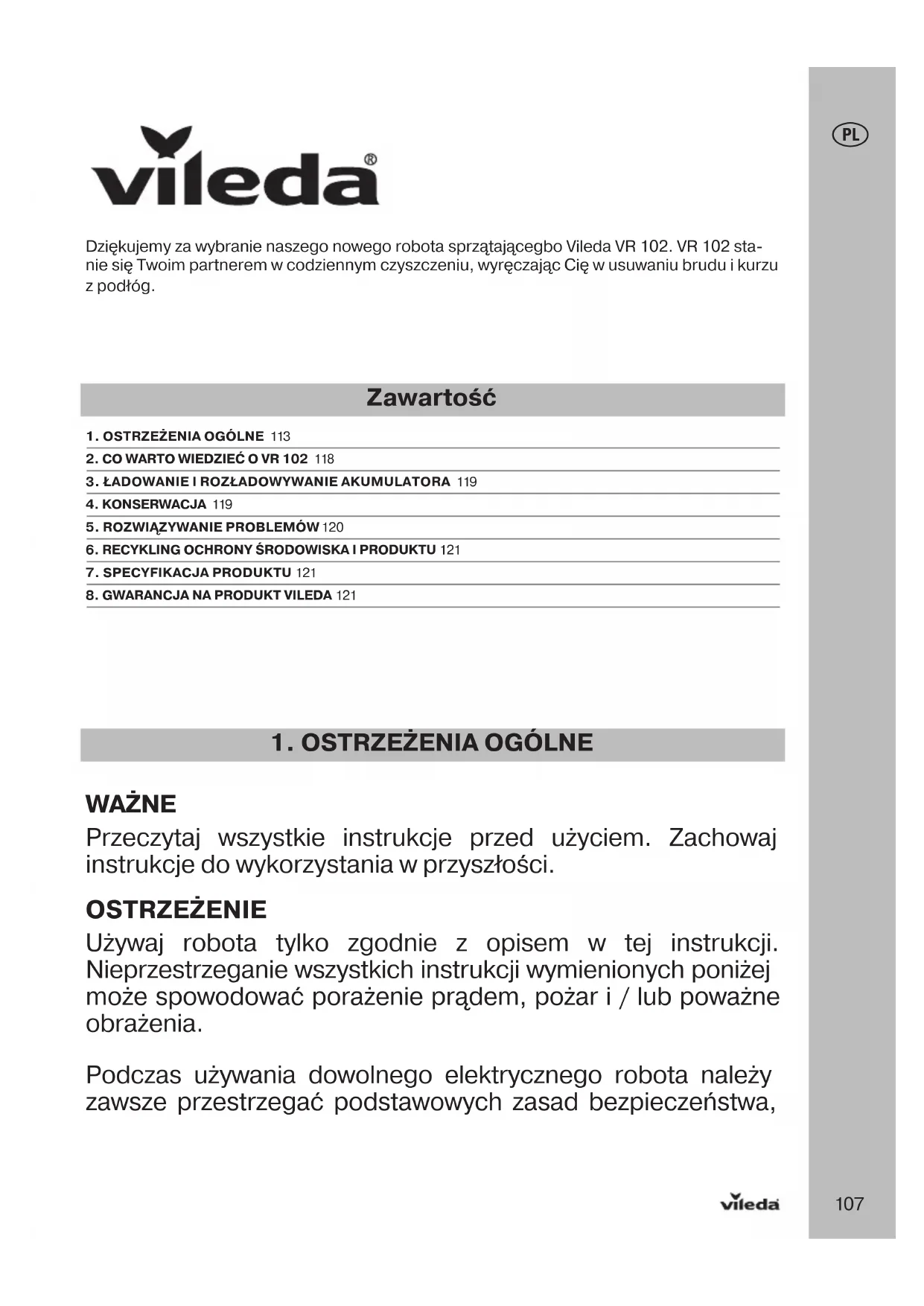 WAŻNE Przeczytaj wszystkie instrukcje przed użyciem. Zachowaj instrukcje do wykorzystania w przyszłości. OSTRZEŻENIE Używaj robota tylko zgodnie z opisem w tej instrukcji. Nieprzestrzeganie wszystkich instrukcji wymienionych poniżej może spowodować porażenie prądem, pożar i / lub poważne obrażenia. Podczas używania dowolnego elektrycznego robota należy zawsze przestrzegać podstawowych zasad bezpieczeństwa, Dziękujemy za wybranie naszego nowego robota sprzątającegbo Vileda VR 102. VR 102 sta- nie się Twoim partnerem w codziennym czyszczeniu, wyręczając Cię w usuwaniu brudu i kurzu z podłóg. Zawartość 1. OSTRZEŻENIA OGÓLNE 1132. CO WARTO WIEDZIEĆ O VR 102 1183. ŁADOWANIE I ROZŁADOWYWANIE AKUMULATORA 1194. KONSERWACJA 1195. ROZWIĄZYWANIE PROBLEMÓW 12 06. RECYKLING OCHRONY ŚRODOWISKA I PRODUKTU 1217. SPECYFIKACJA PRODUKTU 1218. GWARANCJA NA PRODUKT VILEDA 121108