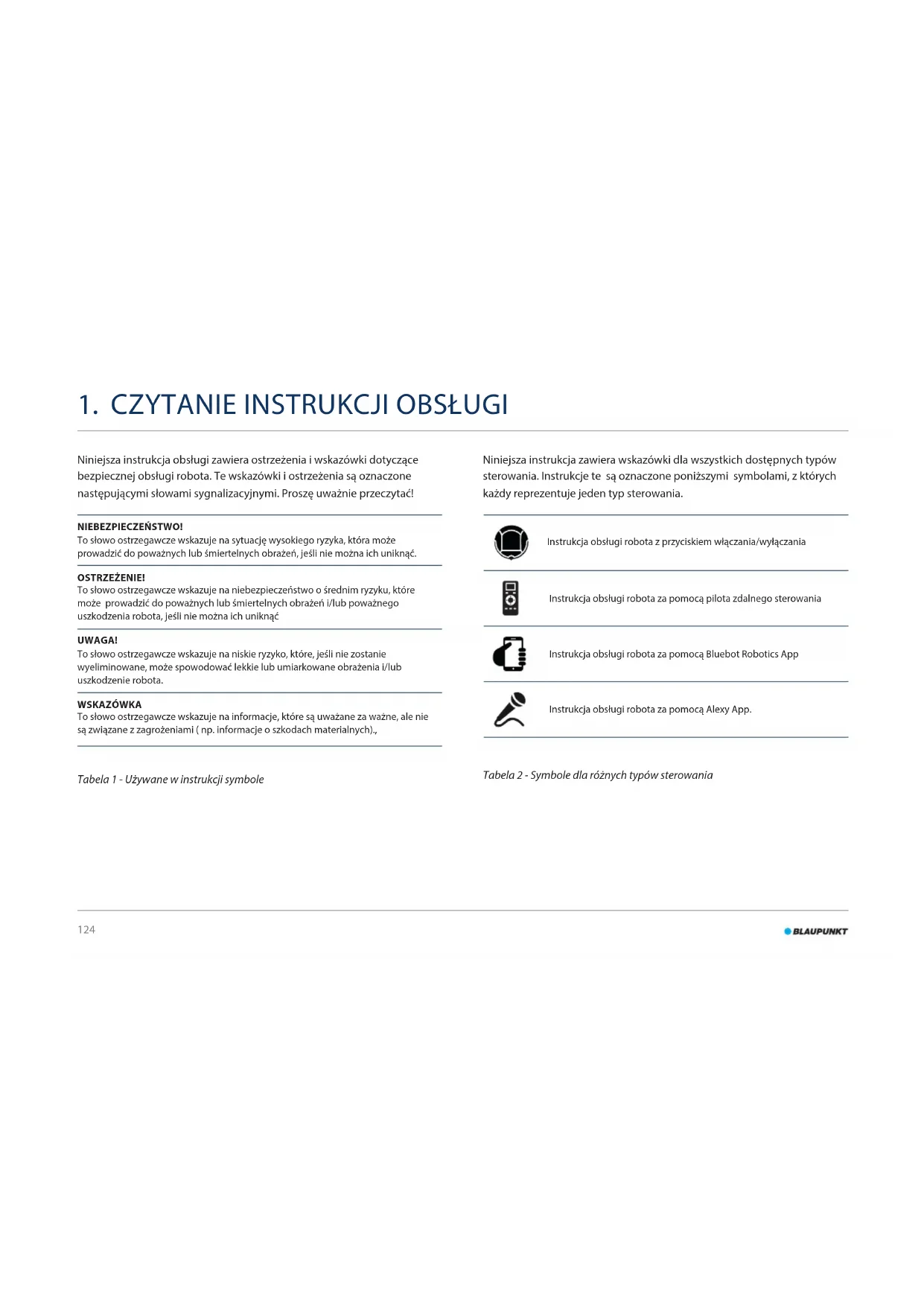 Niniejsza instrukcja obsługi zawiera ostrzeżenia i wskazówki dotyczące bezpiecznej obsługi robota. Te wskazówki i ostrzeżenia są oznaczone następującymi słowami sygnalizacyjnymi. Proszę uważnie przeczytać! NIEBEZPIECZEŃSTWO! To słowo ostrzegawcze wskazuje na sytuację wysokiego ryzyka, która może prowadzić do poważnych lub śmiertelnych obrażeń, jeśli nie można ich uniknąć. OSTRZEŻENIE! To słowo ostrzegawcze wskazuje na niebezpieczeństwo o średnim ryzyku, które może prowadzić do poważnych lub śmiertelnych obrażeń i/lub poważnego uszkodzenia robota, jeśli nie można ich uniknąć UWAGA! To słowo ostrzegawcze wskazuje na niskie ryzyko, które, jeśli nie zostanie wyeliminowane, może spowodować lekkie lub umiarkowane obrażenia i/lub uszkodzenie robota. WSKAZÓWKA To słowo ostrzegawcze wskazuje na informacje, które są uważane za ważne, ale nie są związane z zagrożeniami ( np. informacje o szkodach materialnych)., Tabela 1 - Używane w instrukcji symbole Niniejsza instrukcja zawiera wskazówki dla wszystkich dostępnych typów sterowania. Instrukcje te są oznaczone poniższymi symbolami, z których każdy reprezentuje jeden typ sterowania. Instrukcja obsługi robota z przyciskiem włączania/wyłączania Instrukcja obsługi robota za pomocą pilota zdalnego sterowania Instrukcja obsługi robota za pomocą Bluebot Robotics App Instrukcja obsługi robota za pomocą Alexy App. Tabela 2 - Symbole dla różnych typów sterowania125