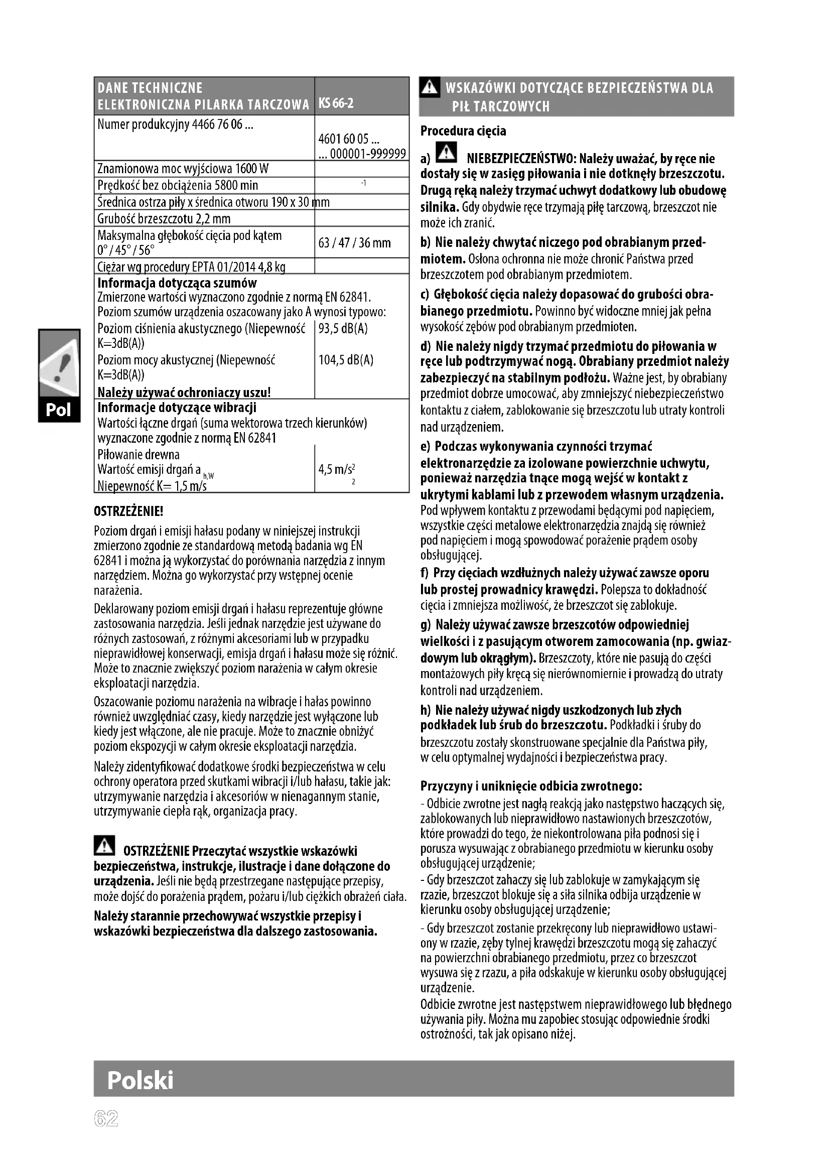 OSTRZEŻENIE! Poziom drgań i emisji hałasu podany w niniejszej instrukcji zmierzono zgodnie ze standardową metodą badania wg EN 62841 i można ją wykorzystać do porównania narzędzia z innym narzędziem. Można go wykorzystać przy wstępnej ocenie narażenia. Deklarowany poziom emisji drgań i hałasu reprezentuje główne zastosowania narzędzia. Jeśli jednak narzędzie jest używane do różnych zastosowań, z różnymi akcesoriami lub w przypadku nieprawidłowej konserwacji, emisja drgań i hałasu może się różnić. Może to znacznie zwiększyć poziom narażenia w całym okresie eksploatacji narzędzia. Oszacowanie poziomu narażenia na wibracje i hałas powinno również uwzględniać czasy, kiedy narzędzie jest wyłączone lub kiedy jest włączone, ale nie pracuje. Może to znacznie obniżyć poziom ekspozycji w całym okresie eksploatacji narzędzia. Należy zidentykować dodatkowe środki bezpieczeństwa w celu ochrony operatora przed skutkami wibracji i/lub hałasu, takie jak: utrzymywanie narzędzia i akcesoriów w nienagannym stanie, utrzymywanie ciepła rąk, organizacja pracy. OSTRZEŻENIE Przeczytać wszystkie wskazówki bezpieczeństwa, instrukcje, ilustracje i dane dołączone do urządzenia. Jeśli nie będą przestrzegane następujące przepisy, może dojść do porażenia prądem, pożaru i/lub ciężkich obrażeń ciała. Należy starannie przechowywać wszystkie przepisy i wskazówki bezpieczeństwa dla dalszego zastosowania. WSKAZÓWKI DOTYCZĄCE BEZPIECZEŃSTWA DLA PIŁ TARCZOWYCH Procedura cięcia
