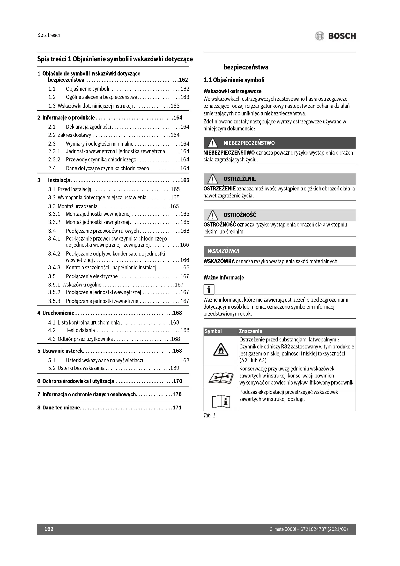6 Ochrona środowiska i utylizacja . . . . . . . . . . . . . . . . . . . . . .170 7 Informacja o ochronie danych osobowych. . . . . . . . . . . . . .170 8 Dane techniczne. . . . . . . . . . . . . . . . . . . . . . . . . . . . . . . . . . . .171 Symbol Znaczenie Ostrzeżenie przed substancjami łatwopalnymi: Czynnik chłodniczy R32 zastosowany w tym produkcie jest gazem o niskiej palności i niskiej toksyczności (A2L lub A2). Konserwację przy uwzględnieniu wskazówek zawartych w instrukcji konserwacji powinien wykonywać odpowiednio wykwalifikowany pracownik. Podczas eksploatacji przestrzegać wskazówek zawartych w instrukcji obsługi.Objaśnienie symboli i wskazówki dotyczące bezpieczeństwa