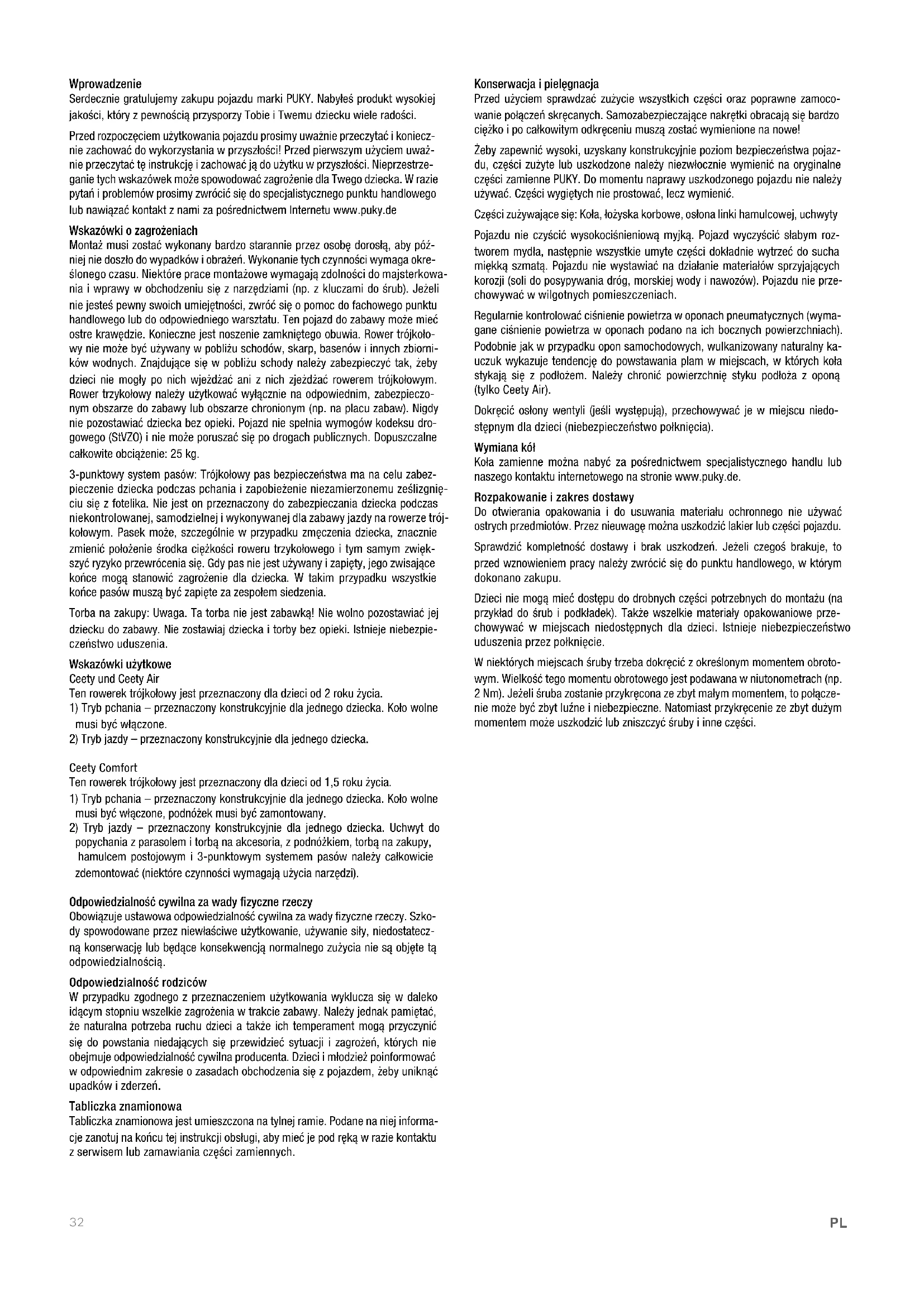 popychania z parasolem i torbą na akcesoria, z podnóżkiem, torbą na zakupy, hamulcem postojowym i 3-punktowym systemem pasów należy całkowicie zdemontować (niektóre czynności wymagają użycia narzędzi). Odpowiedzialność cywilna za wady fizyczne rzeczy Obowiązuje ustawowa odpowiedzialność cywilna za wady fizyczne rzeczy. Szko- dy spowodowane przez niewłaściwe użytkowanie, używanie siły, niedostatecz- ną konserwację lub będące konsekwencją normalnego zużycia nie są objęte tą odpowiedzialnością. Odpowiedzialność rodziców W przypadku zgodnego z przeznaczeniem użytkowania wyklucza się w daleko idącym stopniu wszelkie zagrożenia w trakcie zabawy. Należy jednak pamiętać, że naturalna potrzeba ruchu dzieci a także ich temperament mogą przyczynić się do powstania niedających się przewidzieć sytuacji i zagrożeń, których nie obejmuje odpowiedzialność cywilna producenta. Dzieci i młodzież poinformować w odpowiednim zakresie o zasadach obchodzenia się z pojazdem, żeby uniknąć upadków i zderzeń. Tabliczka znamionowa Tabliczka znamionowa jest umieszczona na tylnej ramie. Podane na niej informa- cje zanotuj na końcu tej instrukcji obsługi, aby mieć je pod ręką w razie kontaktu z serwisem lub zamawiania części zamiennych. Konserwacja i pielęgnacja Przed użyciem sprawdzać zużycie wszystkich części oraz poprawne zamoco- wanie połączeń skręcanych. Samozabezpieczające nakrętki obracają się bardzo ciężko i po całkowitym odkręceniu muszą zostać wymienione na nowe! Żeby zapewnić wysoki, uzyskany konstrukcyjnie poziom bezpieczeństwa pojaz- du, części zużyte lub uszkodzone należy niezwłocznie wymienić na oryginalne części zamienne PUKY. Do momentu naprawy uszkodzonego pojazdu nie należy używać. Części wygiętych nie prostować, lecz wymienić. Części zużywające się: Koła, łożyska korbowe, osłona linki hamulcowej, uchwyty Pojazdu nie czyścić wysokociśnieniową myjką. Pojazd wyczyścić słabym roz- tworem mydła, następnie wszystkie umyte części dokładnie wytrzeć do sucha miękką szmatą. Pojazdu nie wystawiać na działanie materiałów sprzyjających korozji (soli do posypywania dróg, morskiej wody i nawozów). Pojazdu nie prze- chowywać w wilgotnych pomieszczeniach. Regularnie kontrolować ciśnienie powietrza w oponach pneumatycznych (wyma- gane ciśnienie powietrza w oponach podano na ich bocznych powierzchniach). Podobnie jak w przypadku opon samochodowych, wulkanizowany naturalny ka- uczuk wykazuje tendencję do powstawania plam w miejscach, w których koła stykają się z podłożem. Należy chronić powierzchnię styku podłoża z oponą (tylko Ceety Air). Dokręcić osłony wentyli (jeśli występują), przechowywać je w miejscu niedo- stępnym dla dzieci (niebezpieczeństwo połknięcia). Wymiana kół Koła zamienne można nabyć za pośrednictwem specjalistycznego handlu lub naszego kontaktu internetowego na stronie www.puky.de. Rozpakowanie i zakres dostawy Do otwierania opakowania i do usuwania materiału ochronnego nie używać ostrych przedmiotów. Przez nieuwagę można uszkodzić lakier lub części pojazdu. Sprawdzić kompletność dostawy i brak uszkodzeń. Jeżeli czegoś brakuje, to przed wznowieniem pracy należy zwrócić się do punktu handlowego, w którym dokonano zakupu. Dzieci nie mogą mieć dostępu do drobnych części potrzebnych do montażu (na przykład do śrub i podkładek). Także wszelkie materiały opakowaniowe prze- chowywać w miejscach niedostępnych dla dzieci. Istnieje niebezpieczeństwo uduszenia przez połknięcie. W niektórych miejscach śruby trzeba dokręcić z określonym momentem obroto- wym. Wielkość tego momentu obrotowego jest podawana w niutonometrach (np. 2 Nm). Jeżeli śruba zostanie przykręcona ze zbyt małym momentem, to połącze- nie może być zbyt luźne i niebezpieczne. Natomiast przykręcenie ze zbyt dużym momentem może uszkodzić lub zniszczyć śruby i inne części.33