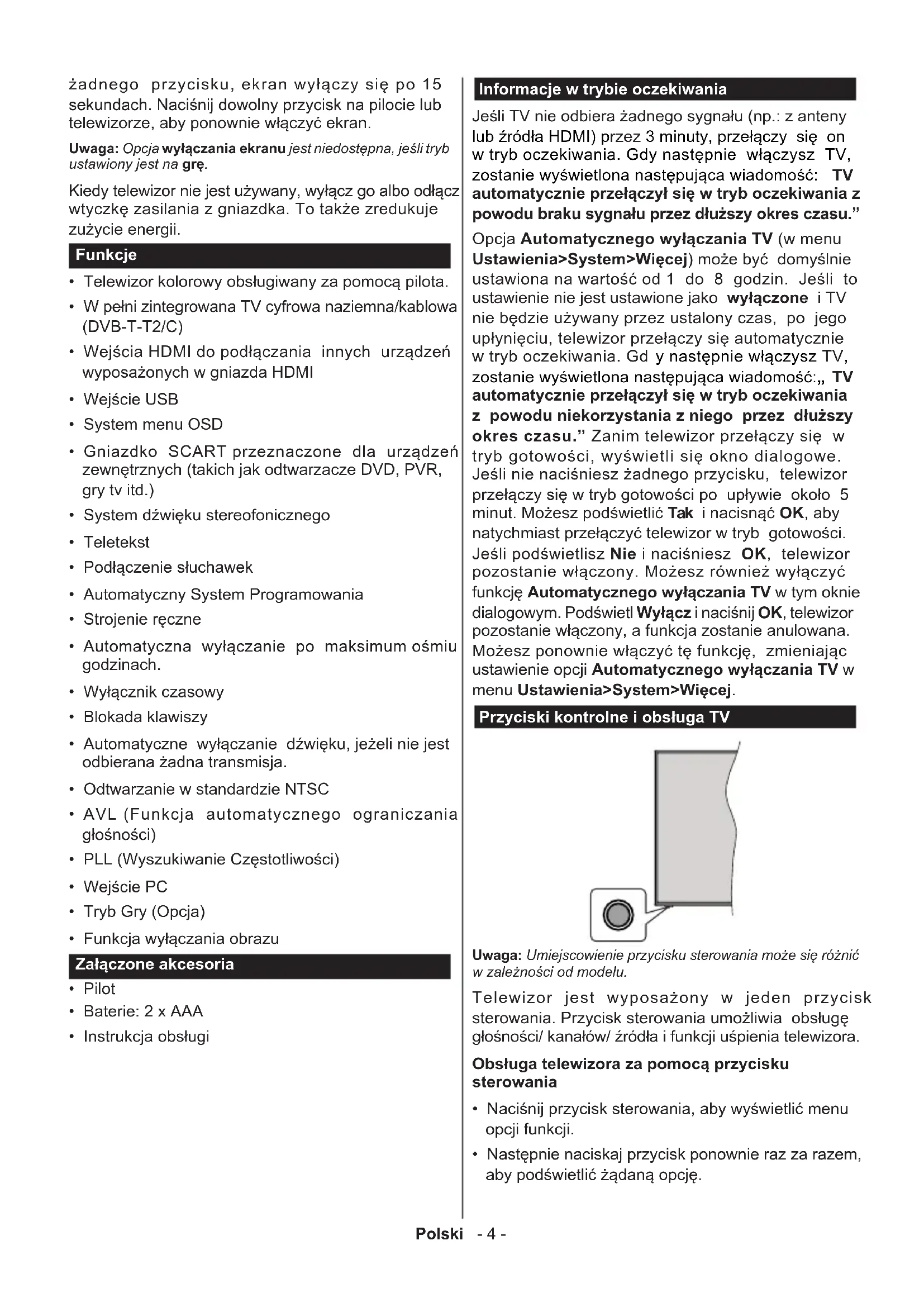 OKPolski - 4 - żadnego przycisku, ekran wyłączy się po 15 sekundach. Naciśnij dowolny przycisk na pilocie lub telewizorze, aby ponownie włączyć ekran. Uwaga: Opcja wyłączania ekranu jest niedostępna, jeśli tryb ustawiony jest na grę. Kiedy telewizor nie jest używany, wyłącz go albo odłącz wtyczkę zasilania z gniazdka. To także zredukuje zużycie energii. Funkcje