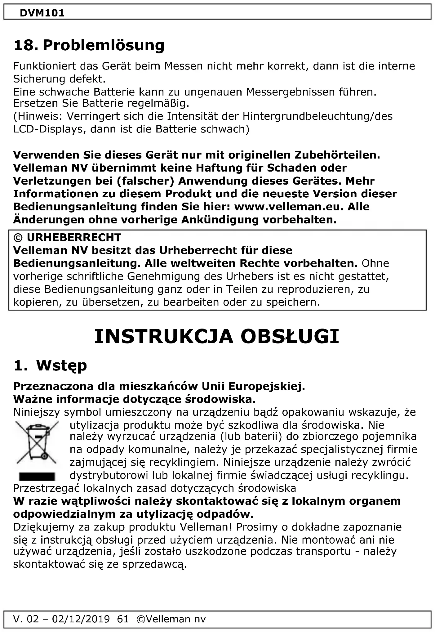 Jeżeli urządzenie podczas pomiaru działa nieprawidłowo, oznacza to usterkę wewnętrznego bezpiecznika. Należy pamiętać, że niski poziom baterii może prowadzić do niewłaściwych wyników pomiarów. Baterię należy regularnie wymieniać. (wskazówka: obniżona jasność podświetlenia/ekranu LCD oznacza niski poziom naładowania baterii) Należy używać wyłącznie oryginalnych akcesoriów. Firma Velleman nv nie ponosi odpowiedzialności za uszkodzenia lub urazy wynikające z (niewłaściwego) korzystania z niniejszego urządzenia. Aby uzyskać więcej informacji dotyczących produktu oraz najnowszą wersję niniejszej instrukcji, należy odwiedzić naszą stronę internetową www.velleman.eu. Informacje zawarte w niniejszej instrukcji obsługi mogą ulec zmianie bez wcześniejszego powiadomienia.