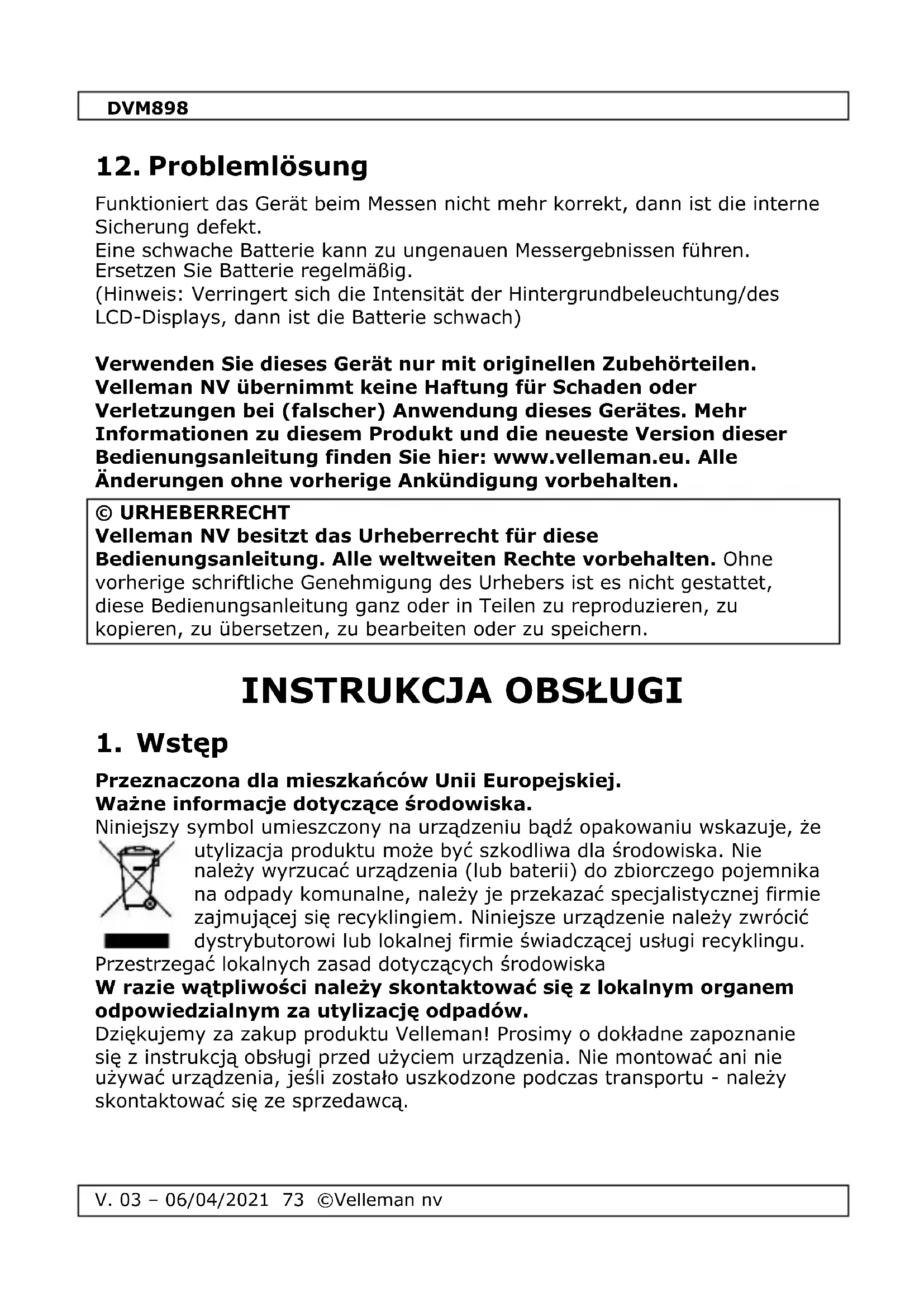 Przeznaczona dla mieszkańców Unii Europejskiej. Ważne informacje dotyczące środowiska. Niniejszy symbol umieszczony na urządzeniu bądź opakowaniu wskazuje, że utylizacja produktu może być szkodliwa dla środowiska. Nie należy wyrzucać urządzenia (lub baterii) do zbiorczego pojemnika na odpady komunalne, należy je przekazać specjalistycznej firmie zajmującej się recyklingiem. Niniejsze urządzenie należy zwrócić dystrybutorowi lub lokalnej firmie świadczącej usługi recyklingu. Przestrzegać lokalnych zasad dotyczących środowiska W razie wątpliwości należy skontaktować się z lokalnym organem odpowiedzialnym za utylizację odpadów. Dziękujemy za zakup produktu Velleman! Prosimy o dokładne zapoznanie się z instrukcją obsługi przed użyciem urządzenia. Nie montować ani nie używać urządzenia, jeśli zostało uszkodzone podczas transportu - należy skontaktować się ze sprzedawcą.DVM898