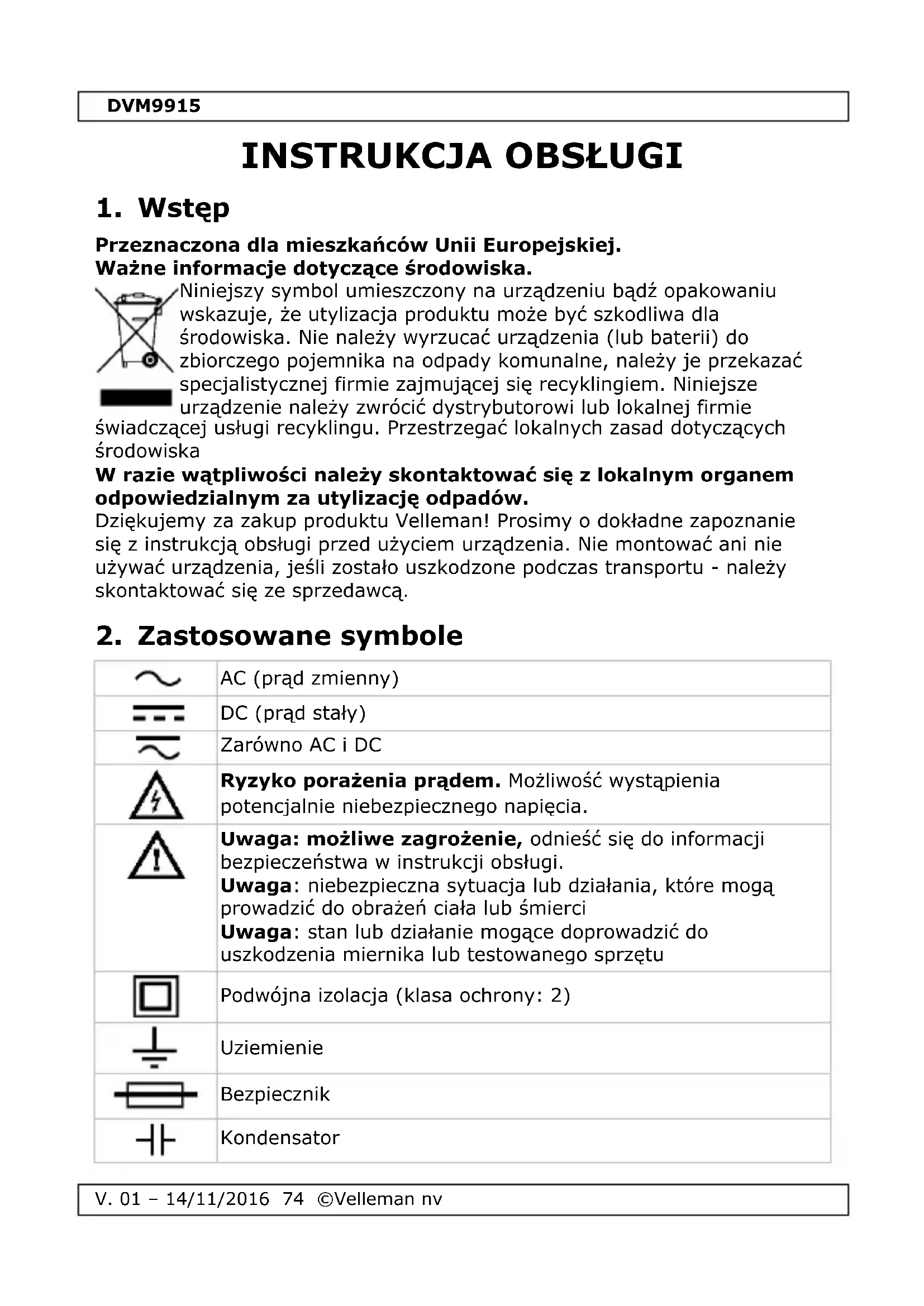 Przeznaczona dla mieszkańców Unii Europejskiej. Ważne informacje dotyczące środowiska. Niniejszy symbol umieszczony na urządzeniu bądź opakowaniu wskazuje, że utylizacja produktu może być szkodliwa dla środowiska. Nie należy wyrzucać urządzenia (lub baterii) do zbiorczego pojemnika na odpady komunalne, należy je przekazać specjalistycznej firmie zajmującej się recyklingiem. Niniejsze urządzenie należy zwrócić dystrybutorowi lub lokalnej firmie świadczącej usługi recyklingu. Przestrzegać lokalnych zasad dotyczących środowiska W razie wątpliwości należy skontaktować się z lokalnym organem odpowiedzialnym za utylizację odpadów. Dziękujemy za zakup produktu Velleman! Prosimy o dokładne zapoznanie się z instrukcją obsługi przed użyciem urządzenia. Nie montować ani nie używać urządzenia, jeśli zostało uszkodzone podczas transportu - należy skontaktować się ze sprzedawcą.