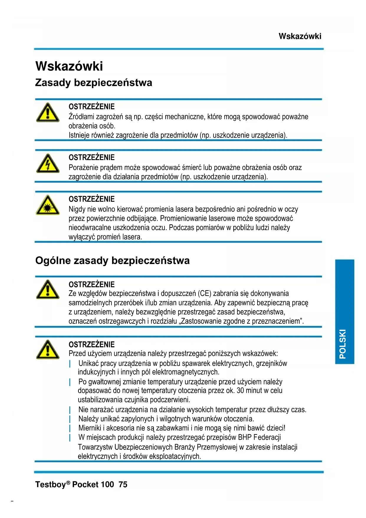 OSTRZEŻENIE Przed użyciem urządzenia należy przestrzegać poniższych wskazówek: | Unikać pracy urządzenia w pobliżu spawarek elektrycznych, grzejników indukcyjnych i innych pól elektromagnetycznych. | Po gwałtownej zmianie temperatury urządzenie przed użyciem należy dopasować do nowej temperatury otoczenia przez ok. 30 minut w celu ustabilizowania czujnika podczerwieni. | Nie narażać urządzenia na działanie wysokich temperatur przez dłuższy czas. | Należy unikać zapylonych i wilgotnych warunków otoczenia. | Mierniki i akcesoria nie są zabawkami i nie mogą się nimi bawić dzieci! | W miejscach produkcji należy przestrzegać przepisów BHP Federacji Towarzystw Ubezpieczeniowych Branży Przemysłowej w zakresie instalacji elektrycznych i środków eksploatacyjnych.Wskazówki 76 Testboy