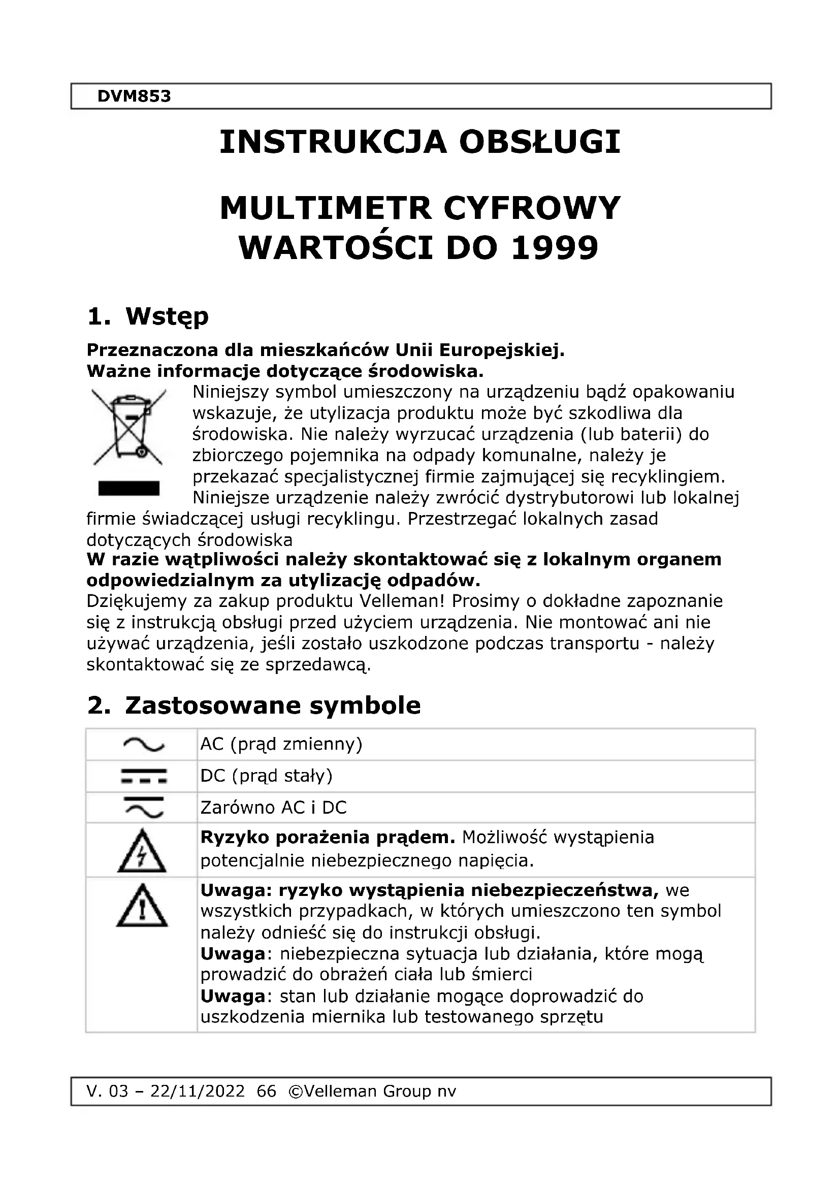 Uwaga: ryzyko wystąpienia niebezpieczeństwa, we wszystkich przypadkach, w których umieszczono ten symbol należy odnieść się do instrukcji obsługi. Uwaga: niebezpieczna sytuacja lub działania, które mogą prowadzić do obrażeń ciała lub śmierci Uwaga: stan lub działanie mogące doprowadzić do uszkodzenia miernika lub testowanego sprzętuDVM853