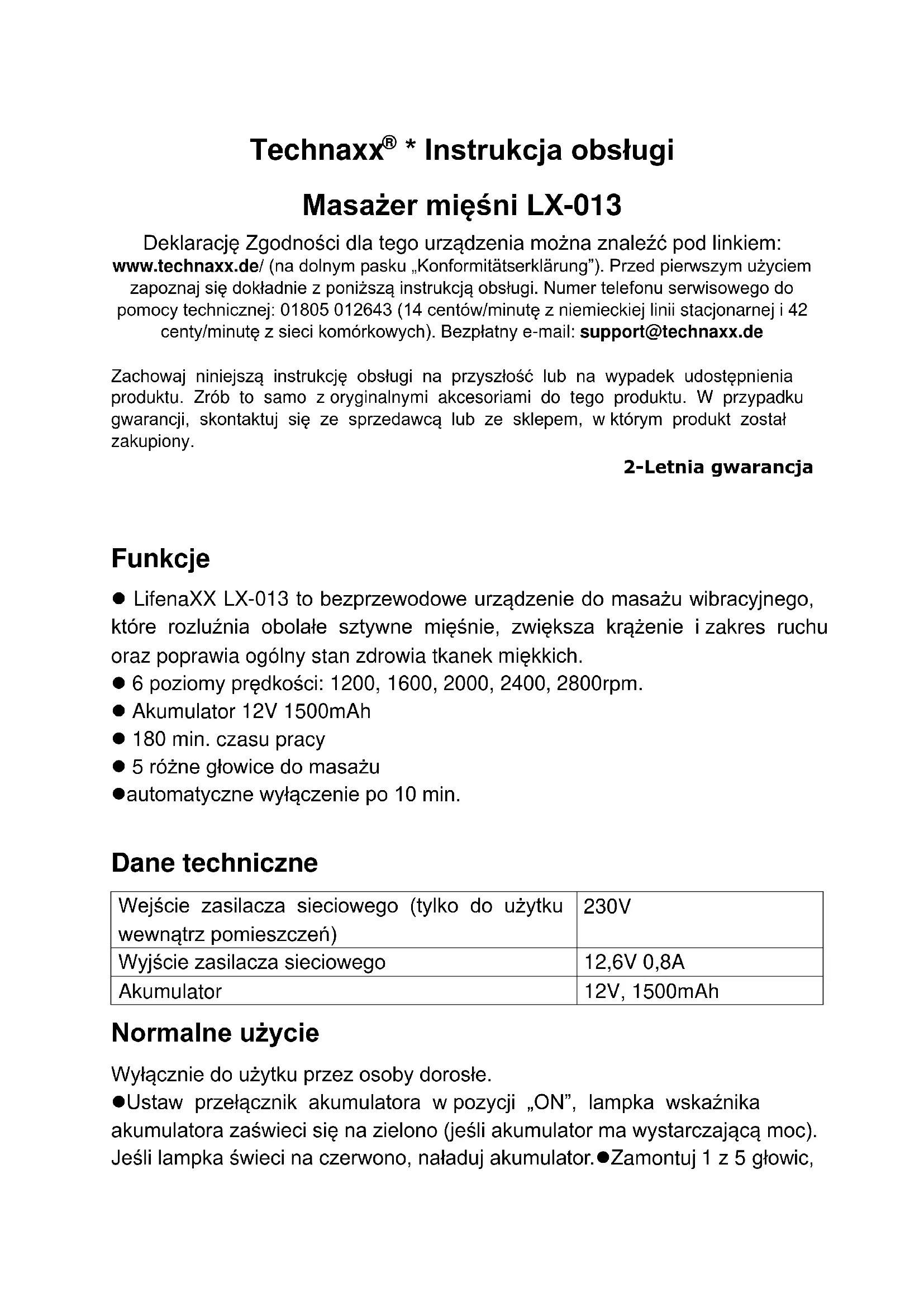 - Instrukcja obsługi Masażer mięśni LX-013 Deklarację Zgodności dla tego urządzenia można znaleźć pod linkiem: www.technaxx.de/ (na dolnym pasku „Konformitätserklärung”). Przed pierwszym użyciem zapoznaj się dokładnie z poniższą instrukcją obsługi. Numer telefonu serwisowego do pomocy technicznej: 01805 012643 (14 centów/minutę z niemieckiej linii stacjonarnej i 42 centy/minutę z sieci komórkowych). Bezpłatny e-mail: support@technaxx.de Zachowaj niniejszą instrukcję obsługi na przyszłość lub na wypadek udostępnienia produktu. Zrób to samo z oryginalnymi akcesoriami do tego produktu. W przypadku gwarancji, skontaktuj się ze sprzedawcą lub ze sklepem, w którym produkt został zakupiony. 2-Letnia gwarancja