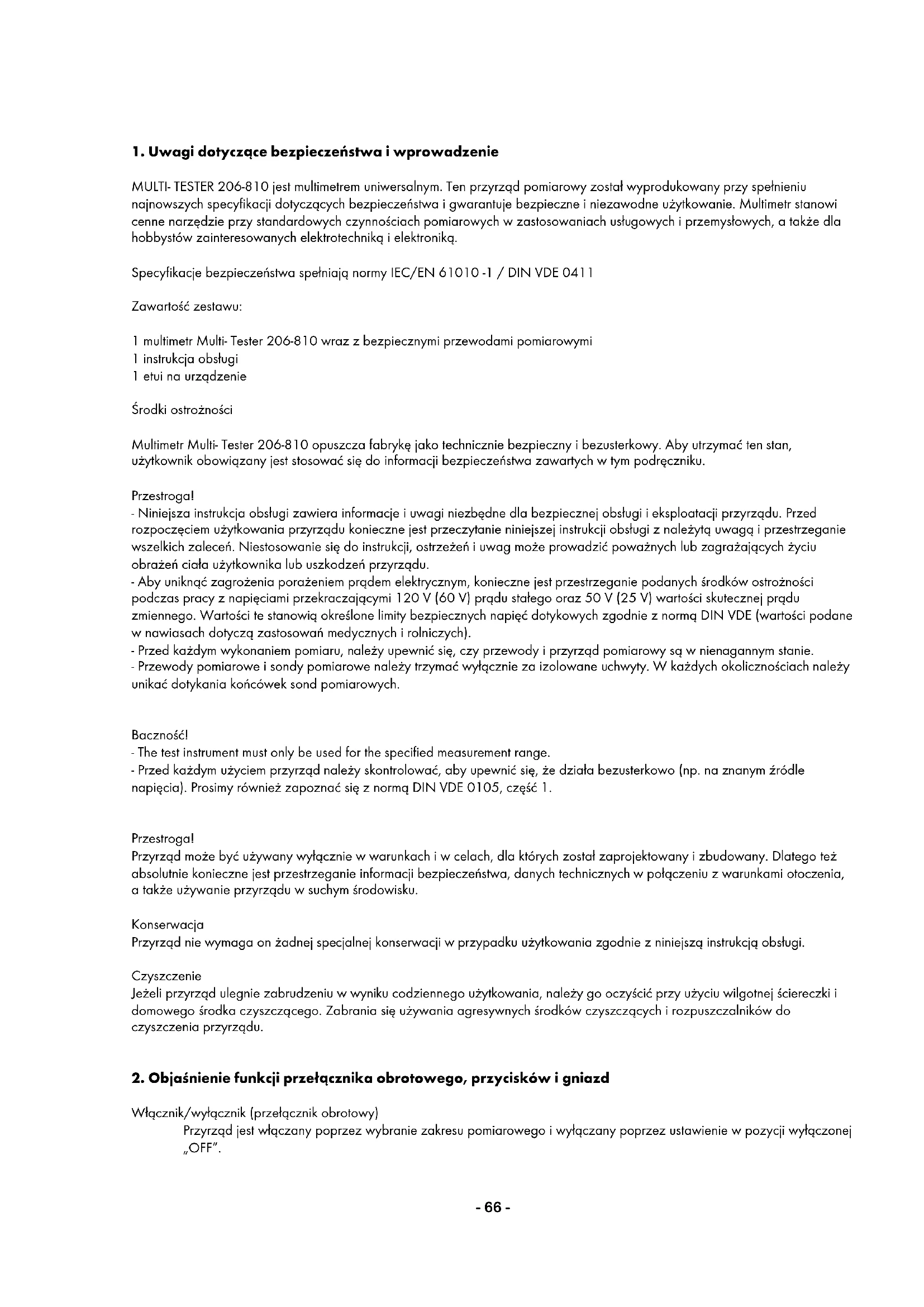 MULTI- TESTER 206-810 jest multimetrem uniwersalnym. Ten przyrząd pomiarowy został wyprodukowany przy spełnieniu najnowszych specyfikacji dotyczących bezpieczeństwa i gwarantuje bezpieczne i niezawodne użytkowanie. Multimetr stanowi cenne narzędzie przy standardowych czynnościach pomiarowych w zastosowaniach usługowych i przemysłowych, a także dla hobbystów zainteresowanych elektrotechniką i elektroniką. Specyfikacje bezpieczeństwa spełniają normy IEC/EN 61010 -1 / DIN VDE 0411 Zawartość zestawu: 1 multimetr Multi- Tester 206-810 wraz z bezpiecznymi przewodami pomiarowymi 1 instrukcja obsługi 1 etui na urządzenie Środki ostrożności Multimetr Multi- Tester 206-810 opuszcza fabrykę jako technicznie bezpieczny i bezusterkowy. Aby utrzymać ten stan, użytkownik obowiązany jest stosować się do informacji bezpieczeństwa zawartych w tym podręczniku. Przestroga! - Niniejsza instrukcja obsługi zawiera informacje i uwagi niezbędne dla bezpiecznej obsługi i eksploatacji przyrządu. Przed rozpoczęciem użytkowania przyrządu konieczne jest przeczytanie niniejszej instrukcji obsługi z należytą uwagą i przestrzeganie wszelkich zaleceń. Niestosowanie się do instrukcji, ostrzeżeń i uwag może prowadzić poważnych lub zagrażających życiu obrażeń ciała użytkownika lub uszkodzeń przyrządu. - Aby uniknąć zagrożenia porażeniem prądem elektrycznym, konieczne jest przestrzeganie podanych środków ostrożności podczas pracy z napięciami przekraczającymi 120 V (60 V) prądu stałego oraz 50 V (25 V) wartości skutecznej prądu zmiennego. Wartości te stanowią określone limity bezpiecznych napięć dotykowych zgodnie z normą DIN VDE (wartości podane w nawiasach dotyczą zastosowań medycznych i rolniczych). - Przed każdym wykonaniem pomiaru, należy upewnić się, czy przewody i przyrząd pomiarowy są w nienagannym stanie. - Przewody pomiarowe i sondy pomiarowe należy trzymać wyłącznie za izolowane uchwyty. W każdych okolicznościach należy unikać dotykania końcówek sond pomiarowych.