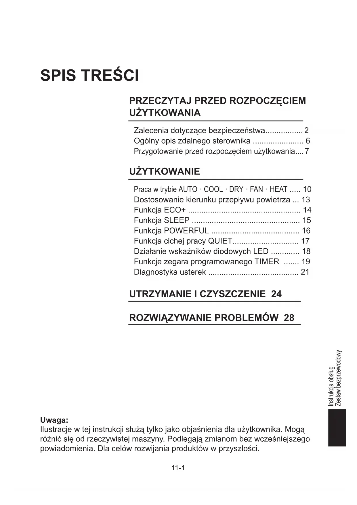 ar condicionado. – Desligue a unidade e contacte o distribuidor. Se a avaria persistir, contacte o seu distribuidor local/técnico de serviço.11-1 Instrukcja obsługi Zestaw bezprzewodowy POLSKIPOLISH Uwaga: Ilustracje w tej instrukcji służą tylko jako objaśnienia dla użytkownika. Mogą różnić się od rzeczywistej maszyny. Podlegają zmianom bez wcześniejszego powiadomienia. Dla celów rozwijania produktów w przyszłości.