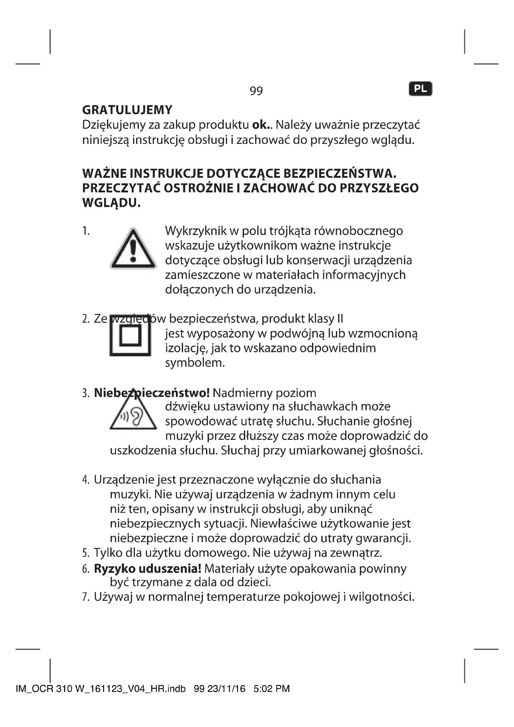 GRATULUJEMY Dziękujemy za zakup produktu ok.. Należy uważnie przeczytać niniejszą instrukcję obsługi i zachować do przyszłego wglądu. WAŻNE INSTRUKCJE DOTYCZĄCE BEZPIECZEŃSTWA. PRZECZYTAĆ OSTROŻNIE I ZACHOWAĆ DO PRZYSZŁEGO WGLĄDU.