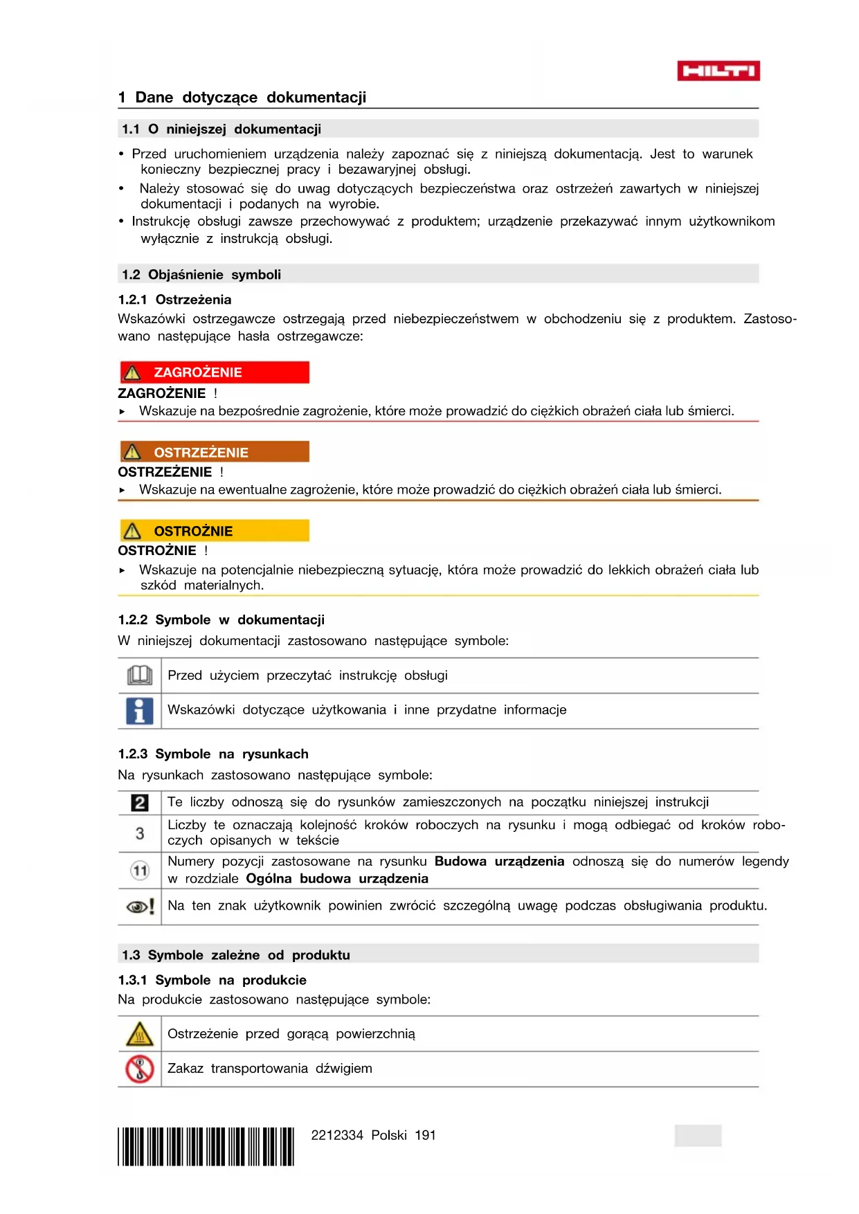 Deklarujemy z pełną odpowiedzialnością, że opisany tutaj produkt jest zgodny z obowiązującymi wytycznymi i normami. Kopia deklaracji zgodności znajduje się na końcu niniejszej dokumentacji. Techniczna dokumentacja zapisana jest tutaj: Hilti Entwicklungsgesellschaft mbH | Zulassung Geräte | Hiltistraße 6 | 86916 Kaufering, DE 2 Bezpieczeństwo