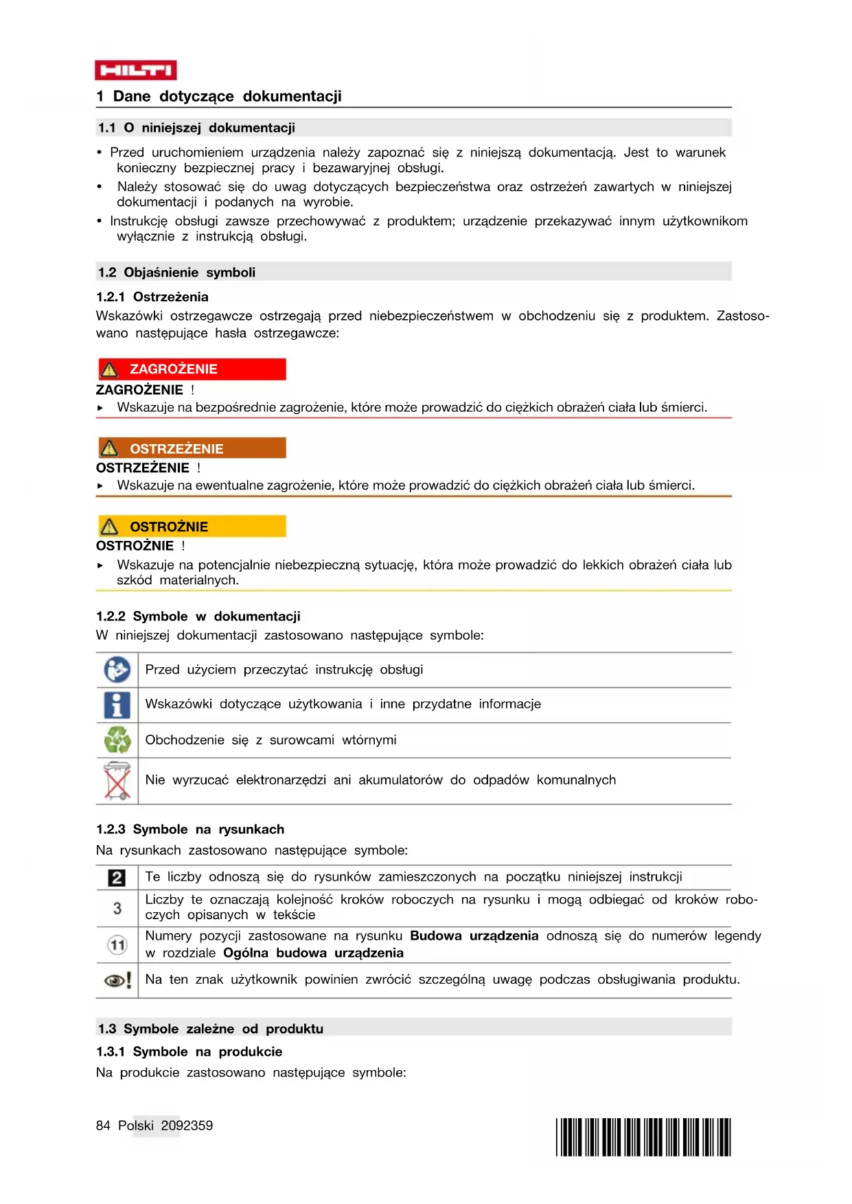 - Po zakończeniu prac konserwacyjnych założyć wszystkie mechanizmy zabezpieczające i skontrolować ich działanie. W celu bezpiecznej pracy stosować wyłącznie oryginalne części zamienne i materiały eksploatacyjne. Dopuszczone przez Hilti części zamienne, materiały eksploatacyjne i wyposażenie produktu są dostępne w lokalnym centrum Hilti Store oraz na: www.hilti.group.94 Polski 2092359 *2092359*