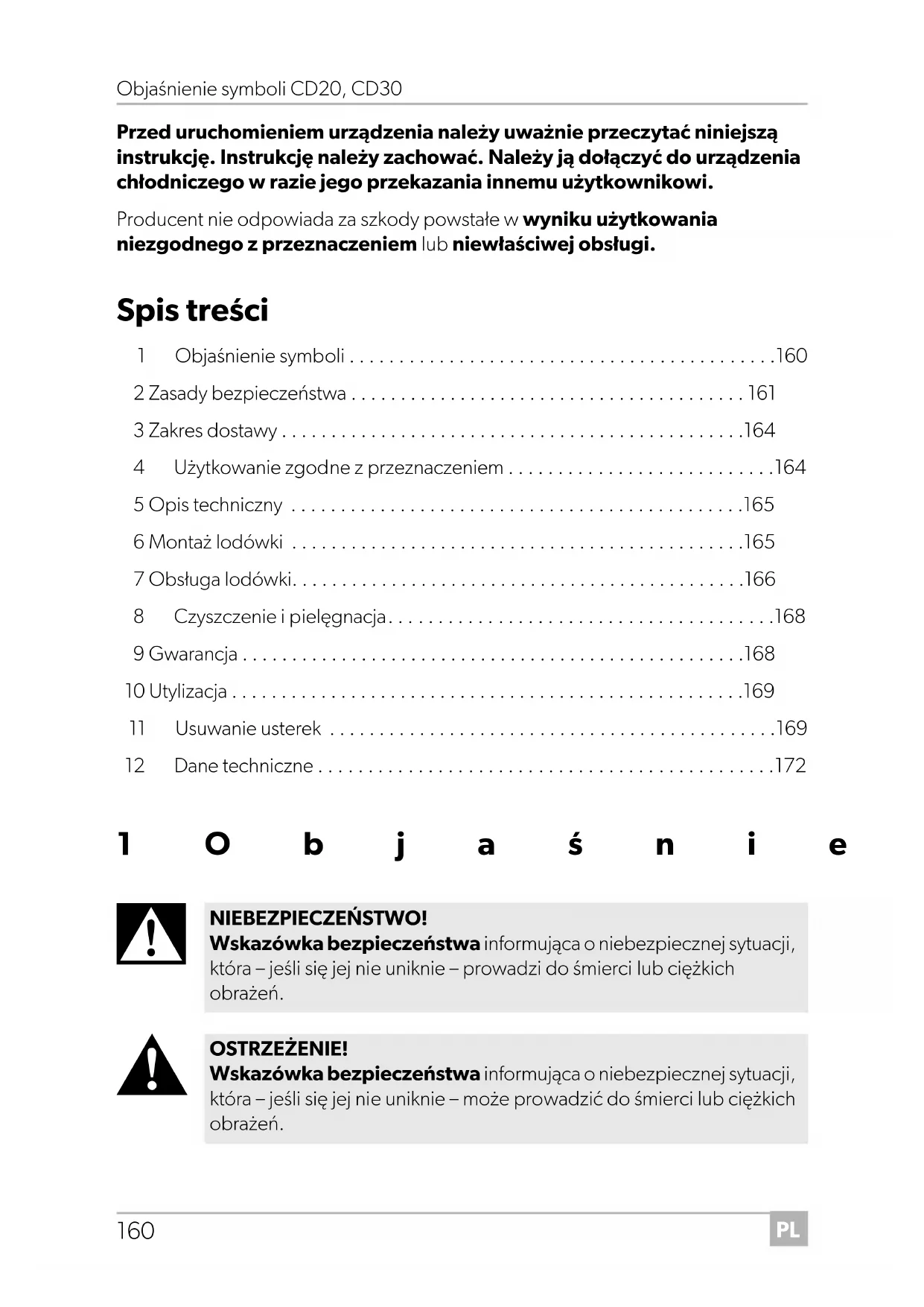 - Przed uruchomieniem urządzenia należy uważnie przeczytać niniejszą instrukcję. Instrukcję należy zachować. Należy ją dołączyć do urządzenia chłodniczego w razie jego przekazania innemu użytkownikowi. Producent nie odpowiada za szkody powstałe w wyniku użytkowania niezgodnego z przeznaczeniem lub niewłaściwej obsługi. Spis treści 1 Objaśnienie symboli p. 160