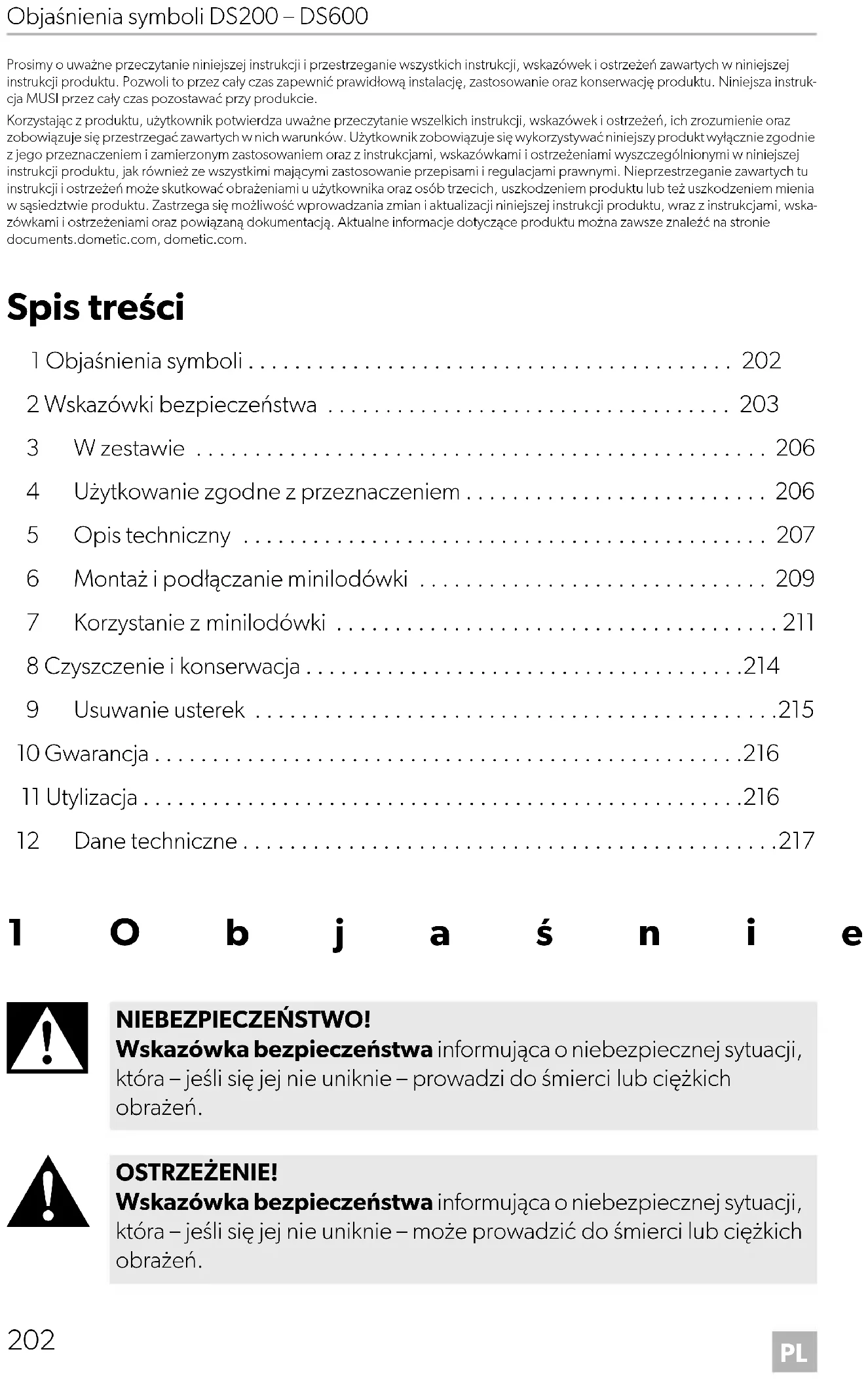 NIEBEZPIECZEŃSTWO! Wskazówka bezpieczeństwa informująca o niebezpiecznej sytuacji, która – jeśli się jej nie uniknie – prowadzi do śmierci lub ciężkich obrażeń. OSTRZEŻENIE! Wskazówka bezpieczeństwa informująca o niebezpiecznej sytuacji, która – jeśli się jej nie uniknie – może prowadzić do śmierci lub ciężkich obrażeń. DometicDS200-300-400-600_IOM_4445103315_EMEA16_2020-xx-xx.book Seite 202 Mittwoch, 3. März 2021 11:36 11PL DS200 – DS600 Wskazówki bezpieczeństwa