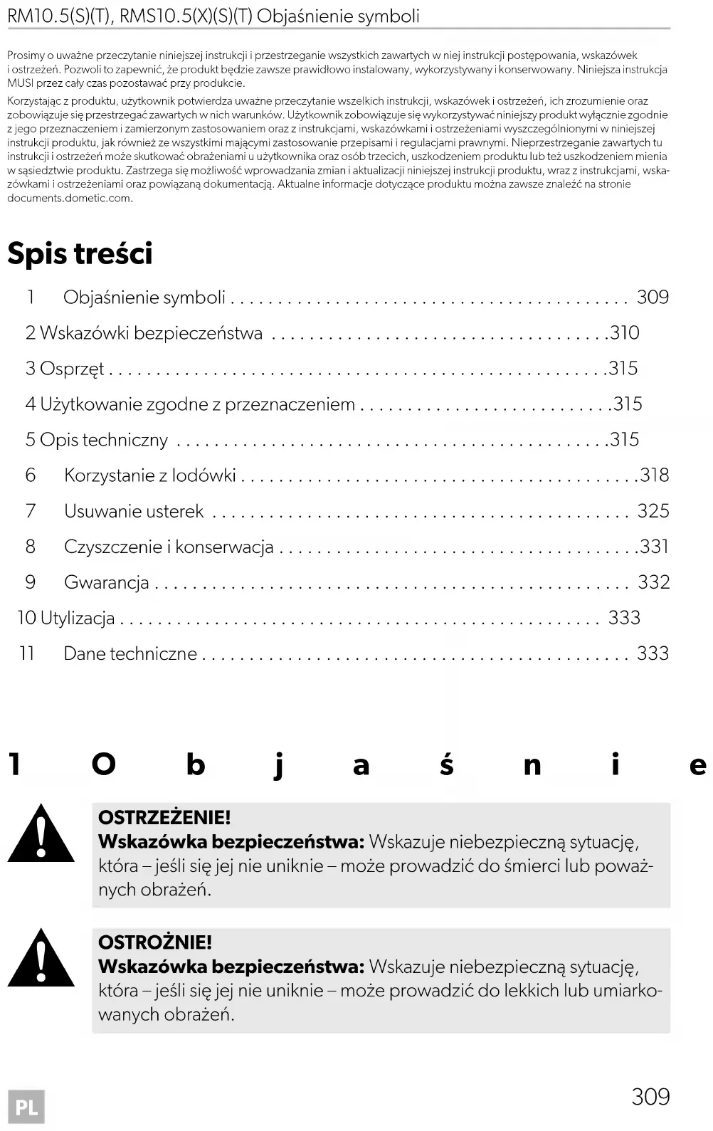 - Prosimy o uważne przeczytanie niniejszej instrukcji i przestrzeganie wszystkich zawartych w niej instrukcji postępowania, wskazówek i ostrzeżeń. Pozwoli to zapewnić, że produkt będzie zawsze prawidłowo instalowany, wykorzystywany i konserwowany. Niniejsza instrukcja MUSI przez cały czas pozostawać przy produkcie. Korzystając z produktu, użytkownik potwierdza uważne przeczytanie wszelkich instrukcji, wskazówek i ostrzeżeń, ich zrozumienie oraz zobowiązuje się przestrzegać zawartych w nich warunków. Użytkownik zobowiązuje się wykorzystywać niniejszy produkt wyłącznie zgodnie z jego przeznaczeniem i zamierzonym zastosowaniem oraz z instrukcjami, wskazówkami i ostrzeżeniami wyszczególnionymi w niniejszej instrukcji produktu, jak również ze wszystkimi mającymi zastosowanie przepisami i regulacjami prawnymi. Nieprzestrzeganie zawartych tu instrukcji i ostrzeżeń może skutkować obrażeniami u użytkownika oraz osób trzecich, uszkodzeniem produktu lub też uszkodzeniem mienia w sąsiedztwie produktu. Zastrzega się możliwość wprowadzania zmian i aktualizacji niniejszej instrukcji produktu, wraz z instrukcjami, wska- zówkami i ostrzeżeniami oraz powiązaną dokumentacją. Aktualne informacje dotyczące produktu można zawsze znaleźć na stronie documents.dometic.com. Spis treści 1 Objaśnienie symboli p. 309