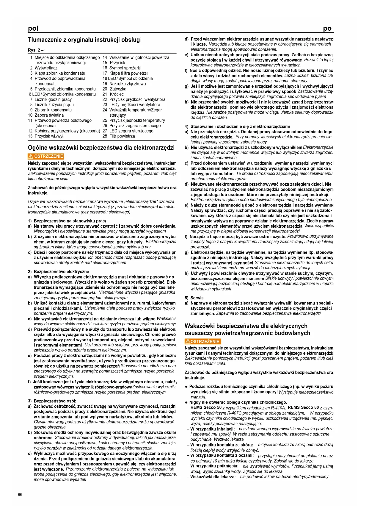 Nigdy nie otwierać obiegu czynnika chłodniczego. REMS Secco 50 z czynnikiem chłodniczym R-410A, REMS Secco 80 z czyn- nikiem chłodniczym R-407C pracującym w obiegu zamkniętym. W przypadku wycieku czynnika chłodniczego w wyniku uszkodzenia urządzenia (np. pęknięcie węża) należy postępować następująco: – W przypadku inhalacji: poszkodowanego wyprowadzić na świeże powietrze i zapewnić mu spokój. W razie zatrzymania oddechu zastosować sztuczne oddychanie. Wezwać lekarza. – W przypadku kontaktu ze skórą: miejsce kontaktu ze skórą odmrozić dużą ilością ciepłej wody względnie obmyć. – W przypadku kontaktu z oczami: przystąpić natychmiast do płukania przez co najmniej 10 min dużą ilością czystej wody. Zgłosić się do lekarza. – W przypadku połknięcia: nie wywoływać wymiotów. Przepłukać jamę ustną wodą, wypić szklankę wody. Zgłosić się do lekarza. – Wskazówki dla lekarza: nie podawać leków na bazie efedryny/adrenaliny. Rys. 2 – 9 1 Miejsce do odkładania odłączanego przewodu przyłączeniowego 2 Wyświetlacz 3 Klapa zbiornika kondensatu 4 Przewód do odprowadzania kondensatu 5 Przełącznik zbiornika kondensatu 6 LED / Symbol zbiornika kondensatu 7 Licznik godzin pracy 8 Licznik zużycia prądu 9 Zbiornik kondensatu 10 Zapora świetlna 11 Przewód powietrza odlotowego (akcesoria) 12 Kołnierz przyłączeniowy (akcesoria) 13 Przycisk wł./wył. 14 Wskazanie wilgotności powietrza 15 Przycisk 16 Symbol sprężarki 17 Klapa fi ltra powietrza 18 LED / Symbol oblodzenia 19 Nakrętka złączkowa 20 Zatyczka 21 Króciec 22 Przycisk prędkości wentylatora 23 LEDy prędkości wentylatora 24 Wskaźnik temperatury/Zegar sterujący 25 Przycisk jednostki temperatury 26 Przycisk zegara sterującego 27 LED zegara sterującego 28 Filtr powietrza pol pol 66pol pol REMS Secco 50