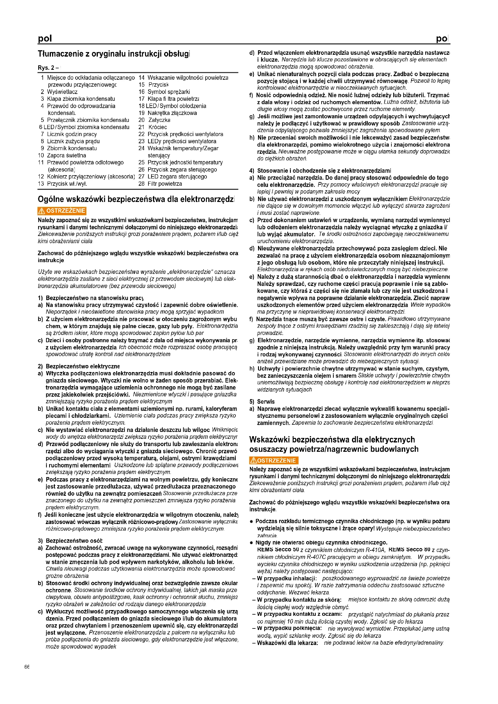 Nigdy nie otwierać obiegu czynnika chłodniczego. REMS Secco 50 z czynnikiem chłodniczym R-410A, REMS Secco 80 z czyn- nikiem chłodniczym R-407C pracującym w obiegu zamkniętym. W przypadku wycieku czynnika chłodniczego w wyniku uszkodzenia urządzenia (np. pęknięcie węża) należy postępować następująco: – W przypadku inhalacji: poszkodowanego wyprowadzić na świeże powietrze i zapewnić mu spokój. W razie zatrzymania oddechu zastosować sztuczne oddychanie. Wezwać lekarza. – W przypadku kontaktu ze skórą: miejsce kontaktu ze skórą odmrozić dużą ilością ciepłej wody względnie obmyć. – W przypadku kontaktu z oczami: przystąpić natychmiast do płukania przez co najmniej 10 min dużą ilością czystej wody. Zgłosić się do lekarza. – W przypadku połknięcia: nie wywoływać wymiotów. Przepłukać jamę ustną wodą, wypić szklankę wody. Zgłosić się do lekarza. – Wskazówki dla lekarza: nie podawać leków na bazie efedryny/adrenaliny. Rys. 2 – 9 1 Miejsce do odkładania odłączanego przewodu przyłączeniowego 2 Wyświetlacz 3 Klapa zbiornika kondensatu 4 Przewód do odprowadzania kondensatu 5 Przełącznik zbiornika kondensatu 6 LED / Symbol zbiornika kondensatu 7 Licznik godzin pracy 8 Licznik zużycia prądu 9 Zbiornik kondensatu 10 Zapora świetlna 11 Przewód powietrza odlotowego (akcesoria) 12 Kołnierz przyłączeniowy (akcesoria) 13 Przycisk wł./wył. 14 Wskazanie wilgotności powietrza 15 Przycisk 16 Symbol sprężarki 17 Klapa fi ltra powietrza 18 LED / Symbol oblodzenia 19 Nakrętka złączkowa 20 Zatyczka 21 Króciec 22 Przycisk prędkości wentylatora 23 LEDy prędkości wentylatora 24 Wskaźnik temperatury/Zegar sterujący 25 Przycisk jednostki temperatury 26 Przycisk zegara sterującego 27 LED zegara sterującego 28 Filtr powietrza pol pol 66pol pol REMS Secco 50